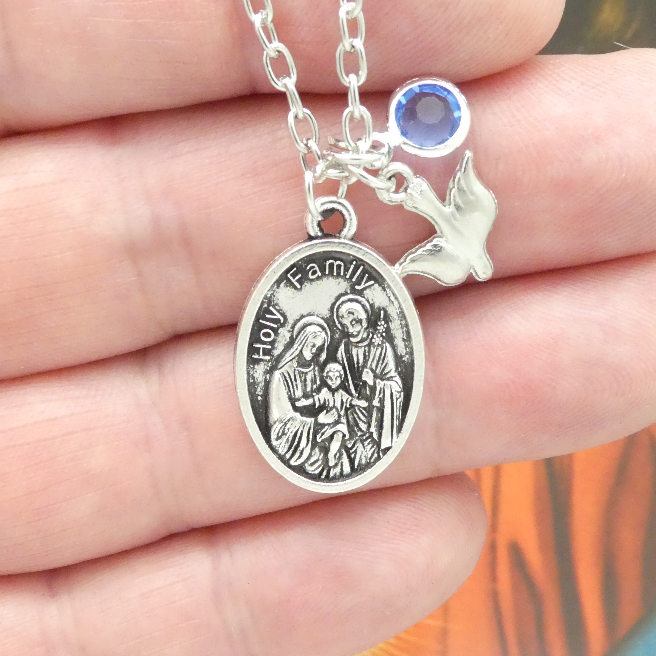 You will receive 1 – Holy Family Medal Necklace, and Holy Spirit Dove Charm with blue crystal and 18 inch cable chain by TIJC. These charms are a quality Silver Pewter for all your jewelry and crafting projects!