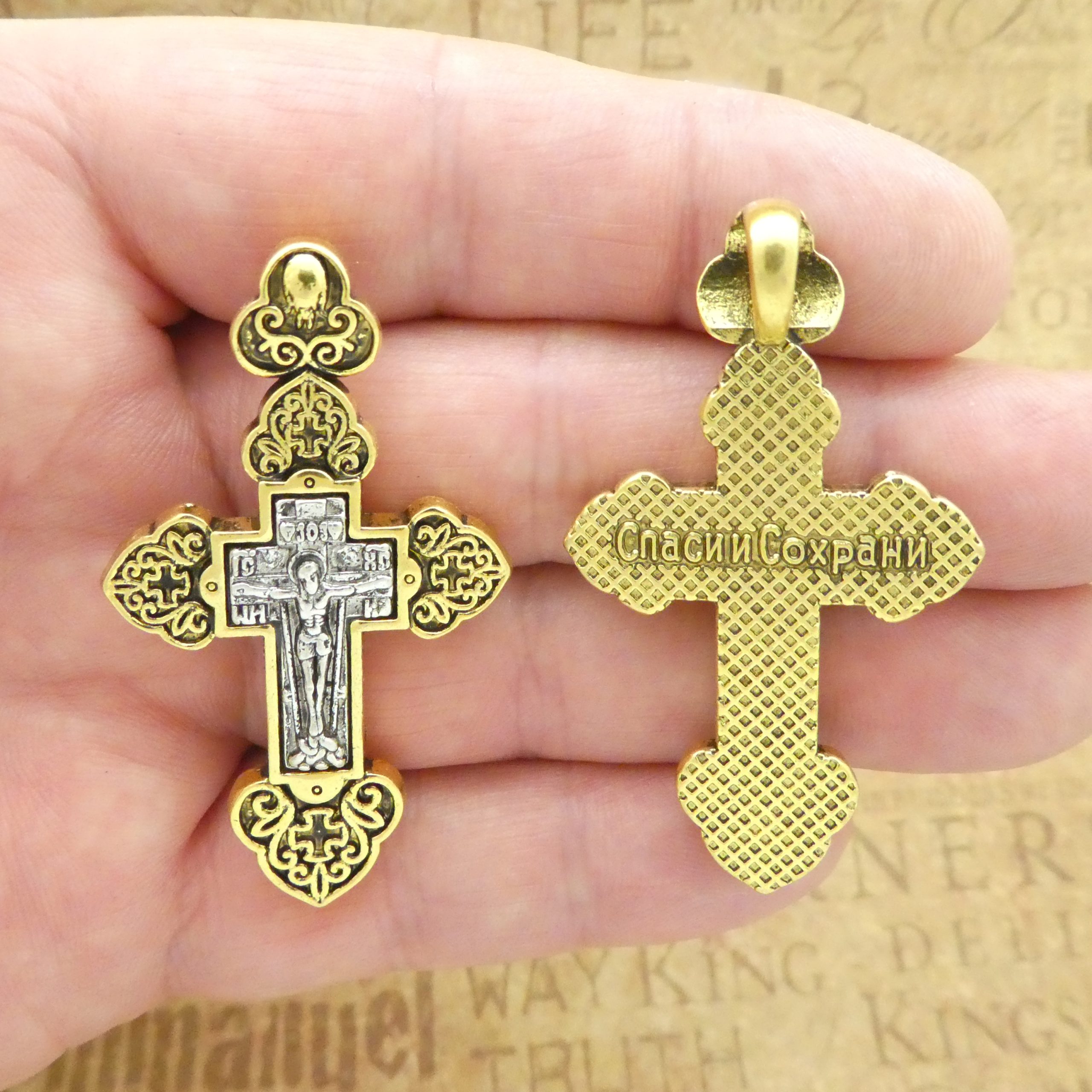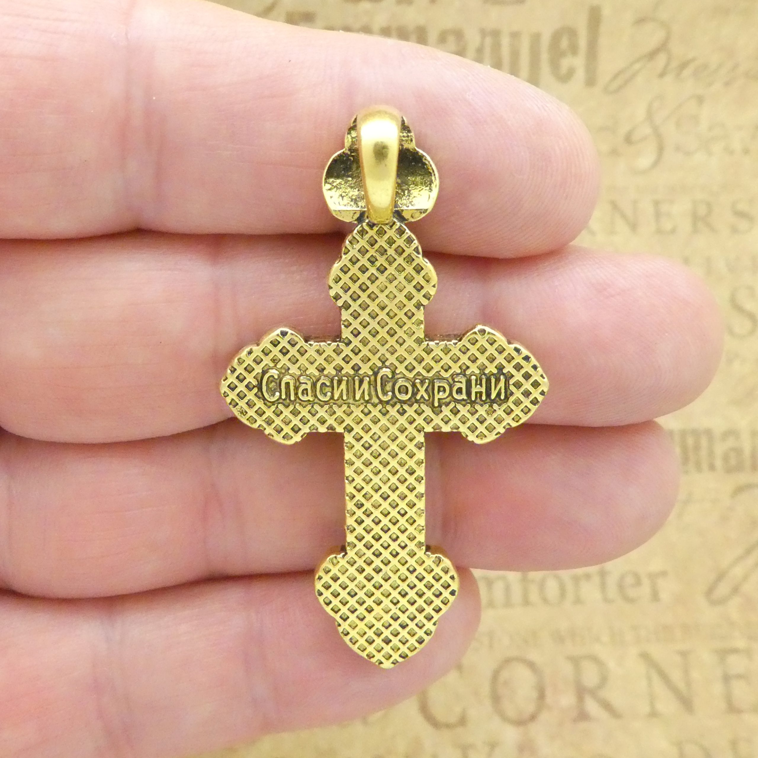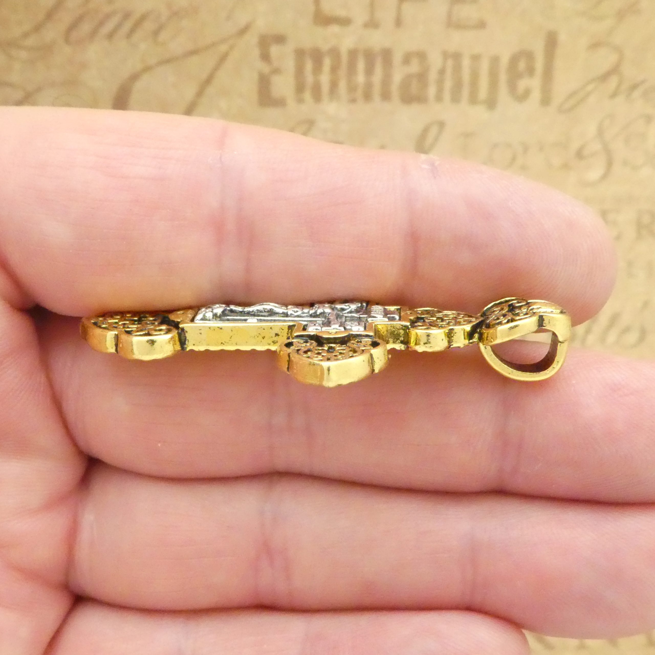 A Gold Crucifix Cross Charm Pendant for Rosary Parts with Silver Tone – Bring Faith and Devotion to Your Rosary. The Gold Crucifix Cross Charm Pendant for Rosary Parts with Silver Tone is the perfect way to bring faith and devotion to your rosary. This beautiful charm is made of solid pewter and features a detailed gold plated cross design with a silver tone crucifix. The pendant is 2 inches in length and 1.25 inches in width, making it the perfect size to add to any rosary. It is also lightweight, so you can easily hang it on your rosary or necklace. The charm does not come with a jump ring, so you can easily attach it to your favorite rosary.
