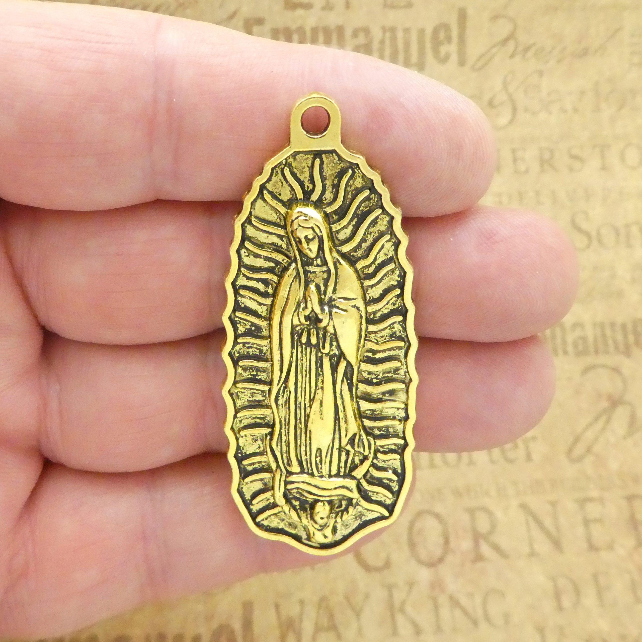 You will receive 1 – Antique Gold Pewter Lady Guadalupe Virgin Mary Pendant by TIJC. These charms are a quality Gold Pewter for all your jewelry and crafting projects!