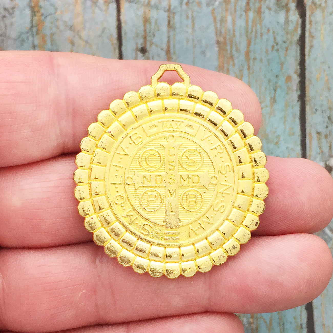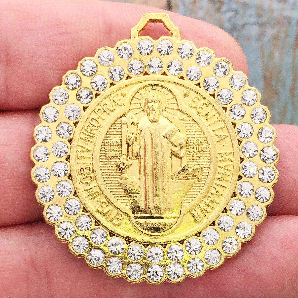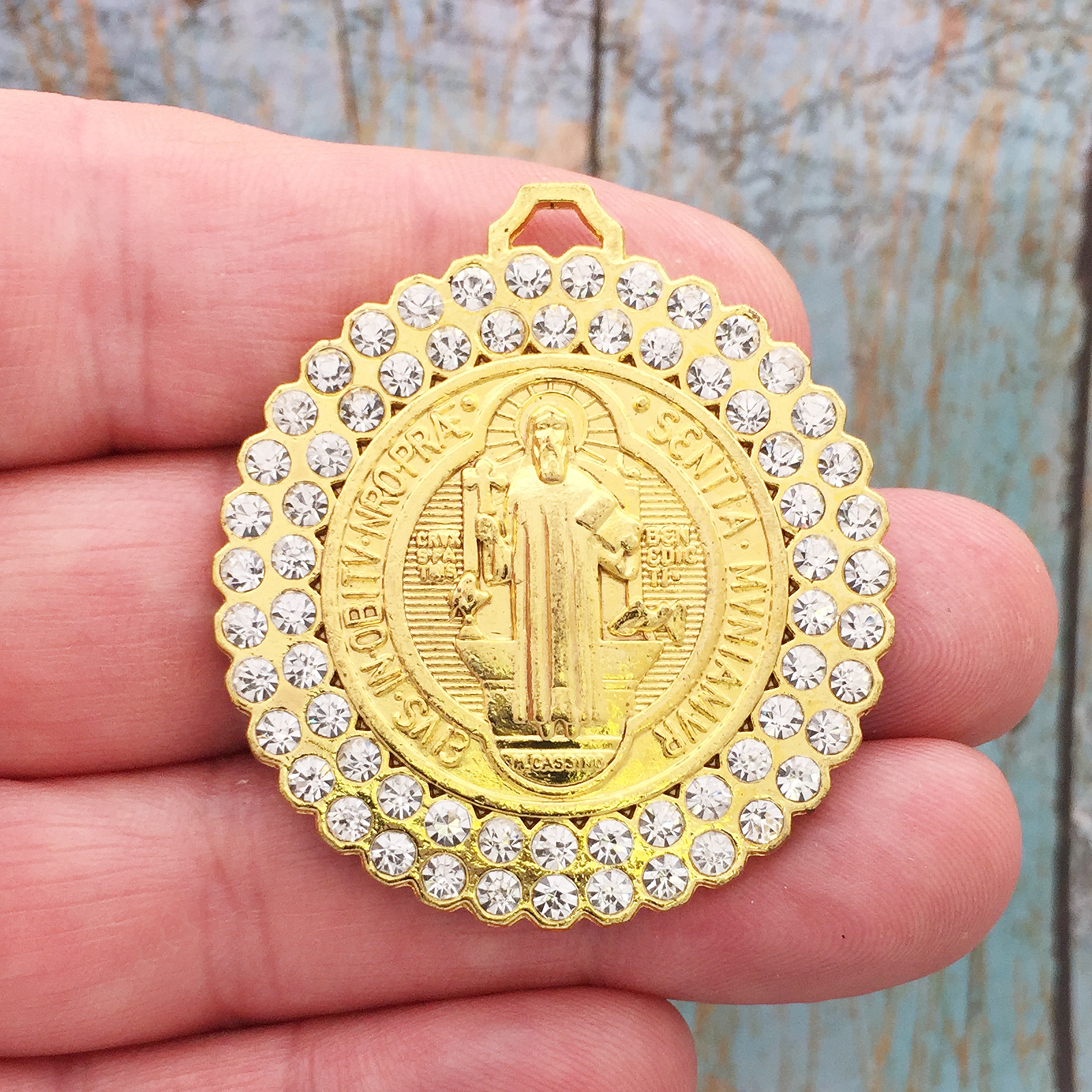 You will receive 1 – Gold St Benedict Medal with 2 rows of Crystal double sided in Pewter by TIJC. These charms are a quality Pewter for all your jewelry and crafting projects!