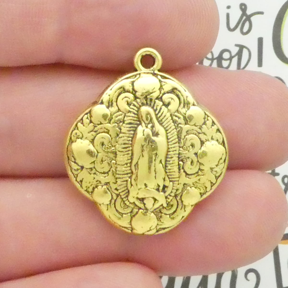 You will receive 1 – Antique Gold Pewter Lady Guadalupe Virgin Mary Pendant. These charms are a quality Pewter for all your jewelry and crafting projects!