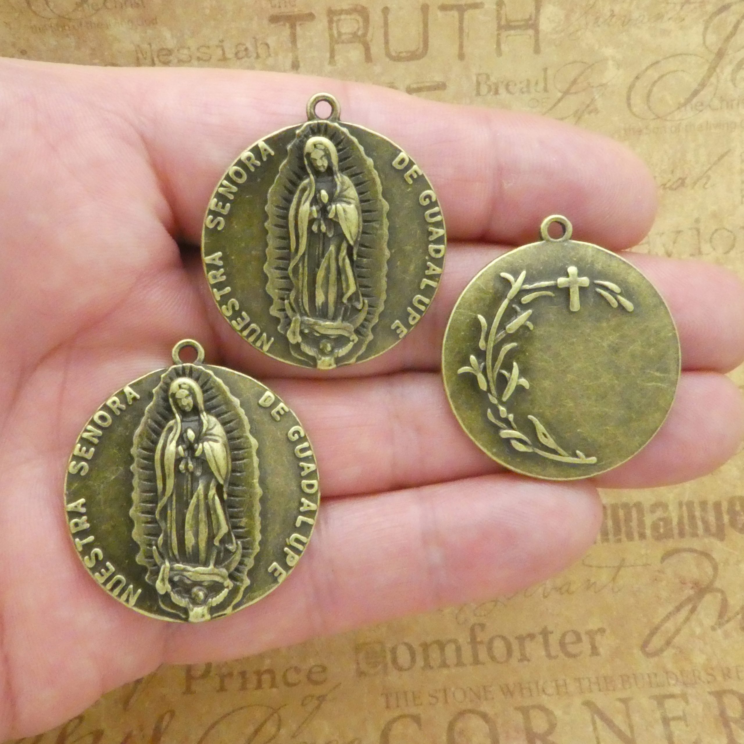 You will receive 1 – Large Round Antique Bronze Pewter Lady Guadalupe Virgin Mary Pendant by TIJC. These charms are a quality Pewter for all your jewelry and crafting projects!