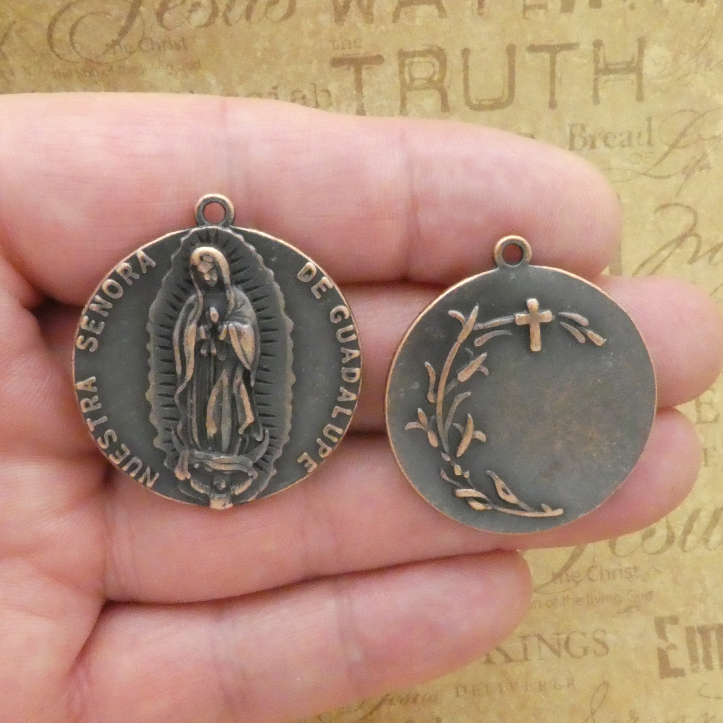 You will receive 1 – Large Round Antique Copper Pewter Lady Guadalupe Virgin Mary Pendant by TIJC. These charms are a quality Pewter for all your jewelry and crafting projects!