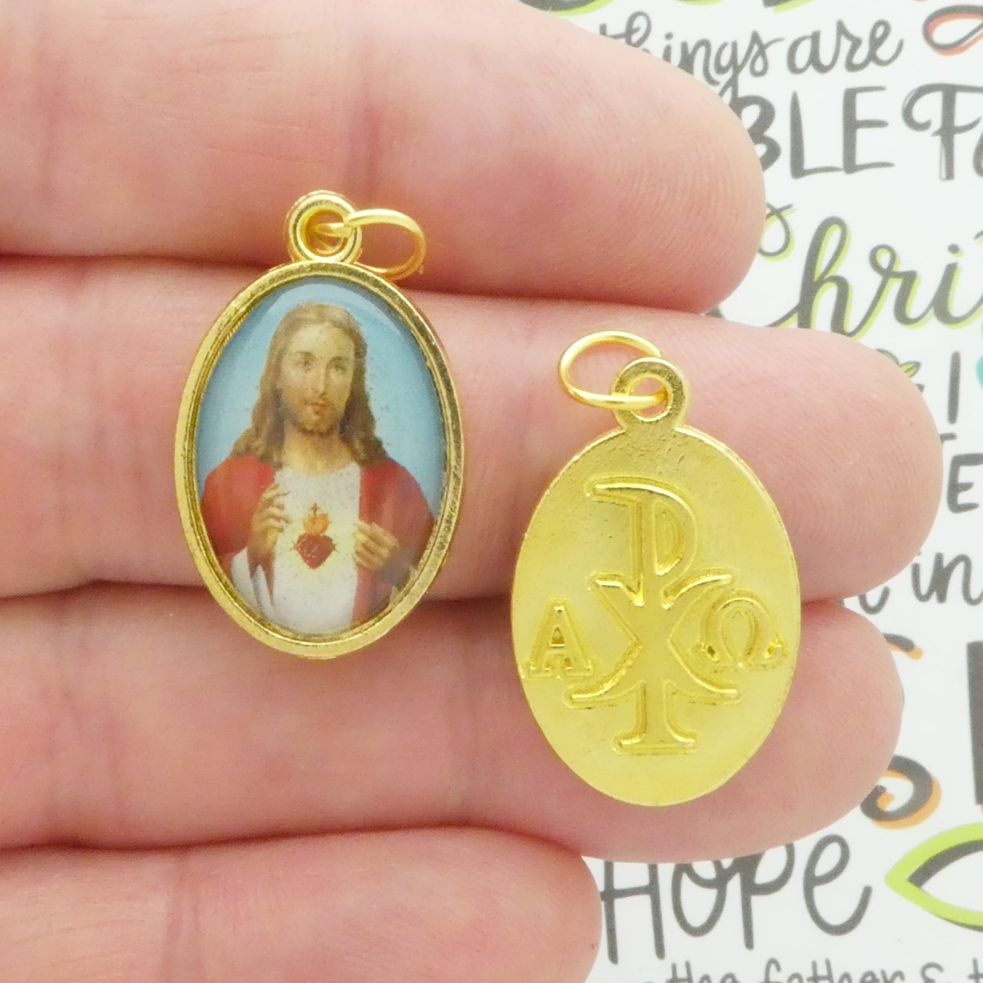 You will receive 1 – Sacred Heart of Jesus Medal with Chi Rho Alpha and Omega Symbol in Gold Pewter. These charms are a quality Pewter for all your jewelry and crafting projects!