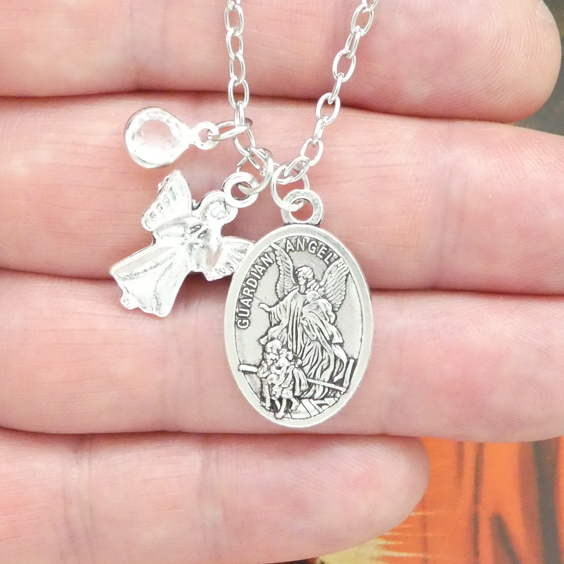 The Silver St Michael Charm with Guardian Angel Necklace is a beautiful piece of jewelry that is perfect for any occasion. This necklace features a small, silver pewter charm of St Michael the Archangel, with a detailed engraving of a guardian angel. The delicate and intricate charm is suspended from a fine silver tone cable chain, making it a timeless piece of jewelry. The necklace also includes a guardian angel charm with a crystal. This necklace is an excellent way to add a touch of faith and divine protection to any outfit. The charms are small enough to be comfortable and lightweight, yet still makes a statement. The silver finish provides a beautiful shine that will catch the eye and shine in the light. The Silver St Michael Charm with Guardian Angel Necklace is a perfect gift for any special occasion. It can be worn as a reminder of the divine protection that is always present, or simply to add a unique and beautiful touch to any outfit. The necklace is also an ideal way to show your faith and devotion to St Michael and the guardian angel. Whether you are looking for a gift for a loved one or for yourself, this necklace is sure to bring a smile to anyone’s face.