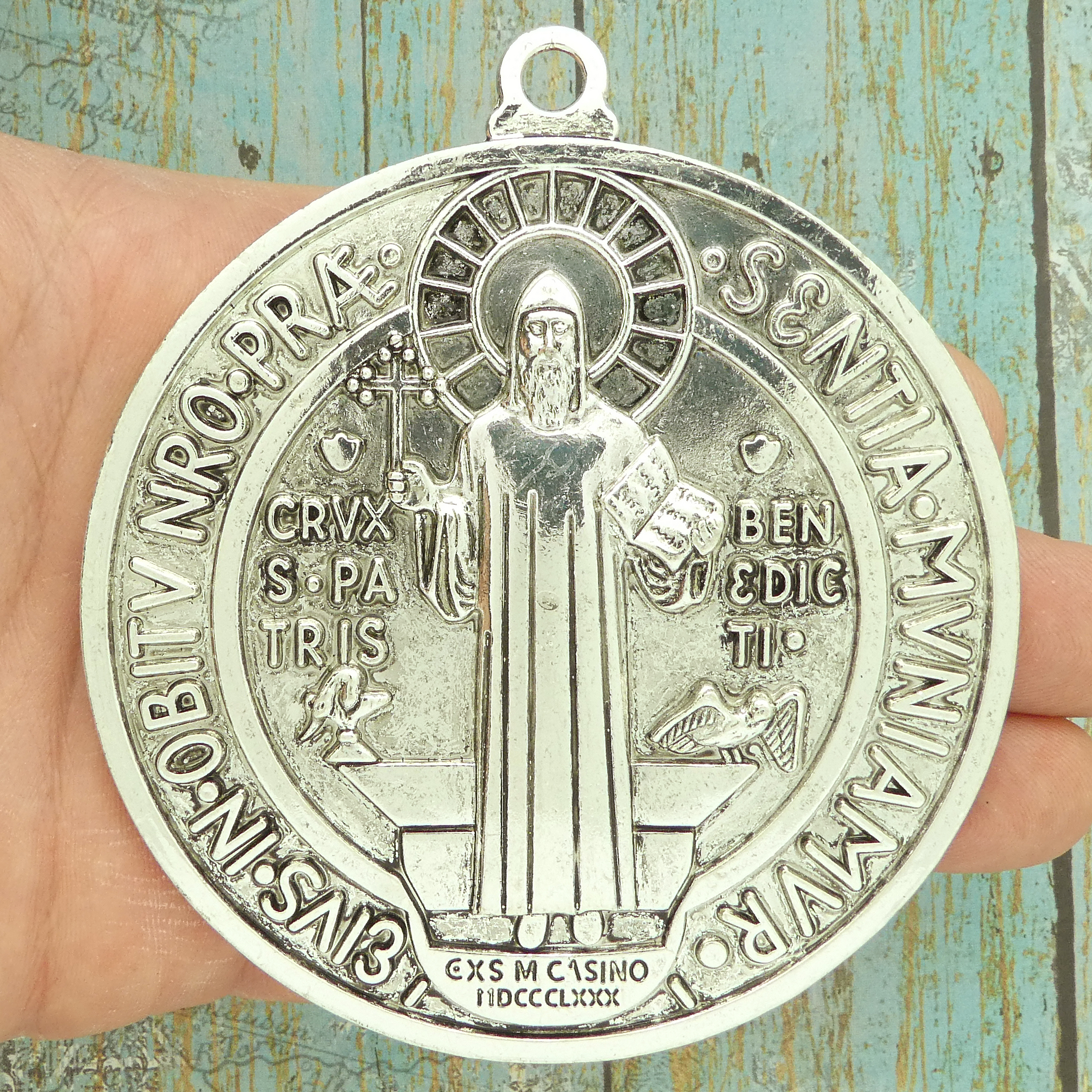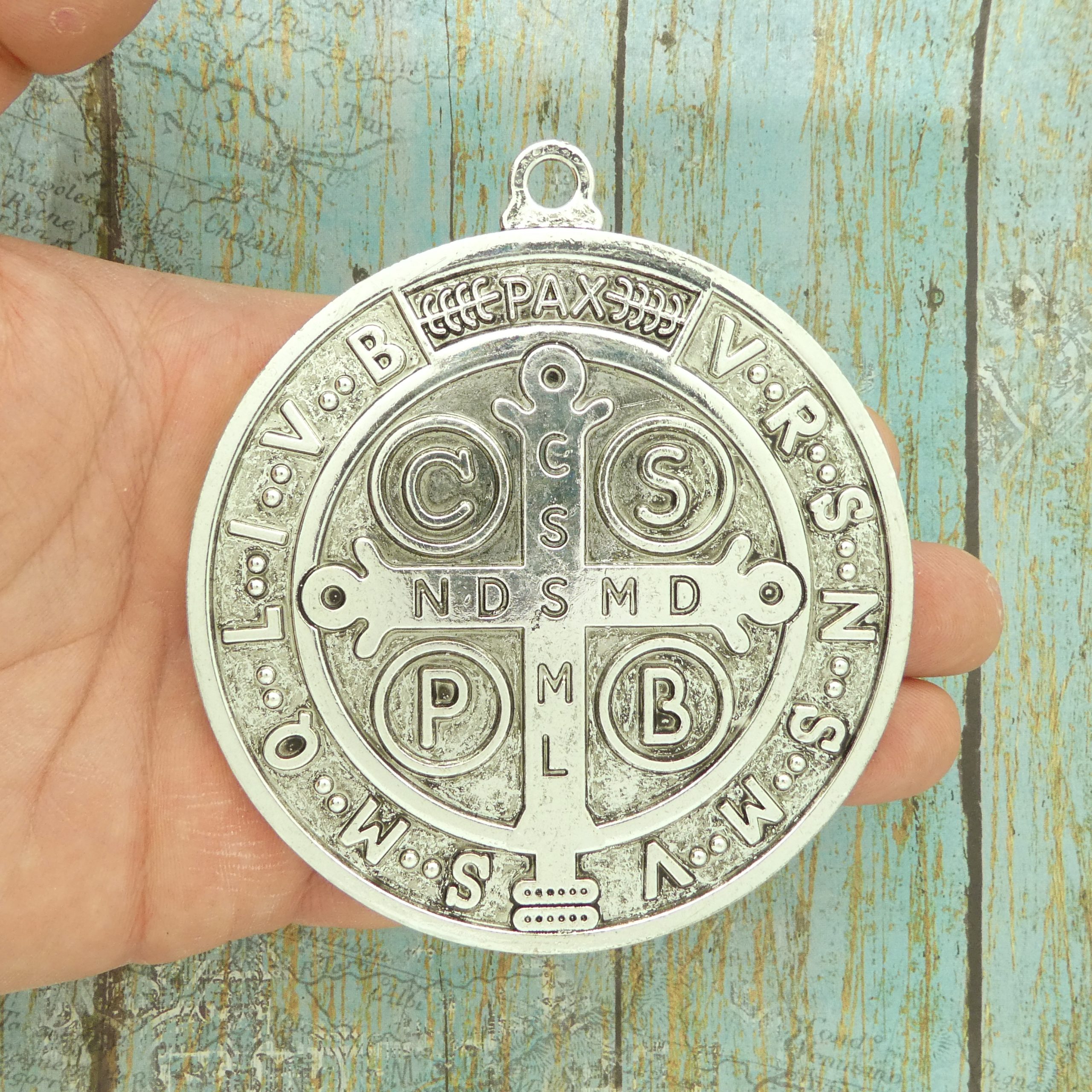 You will receive 1 – Silver Extra Large St Benedict Medal Door Hanger double sided in Pewter 101mmx90mmx5mm by TIJC. These charms are a quality Pewter for all your jewelry and crafting projects!