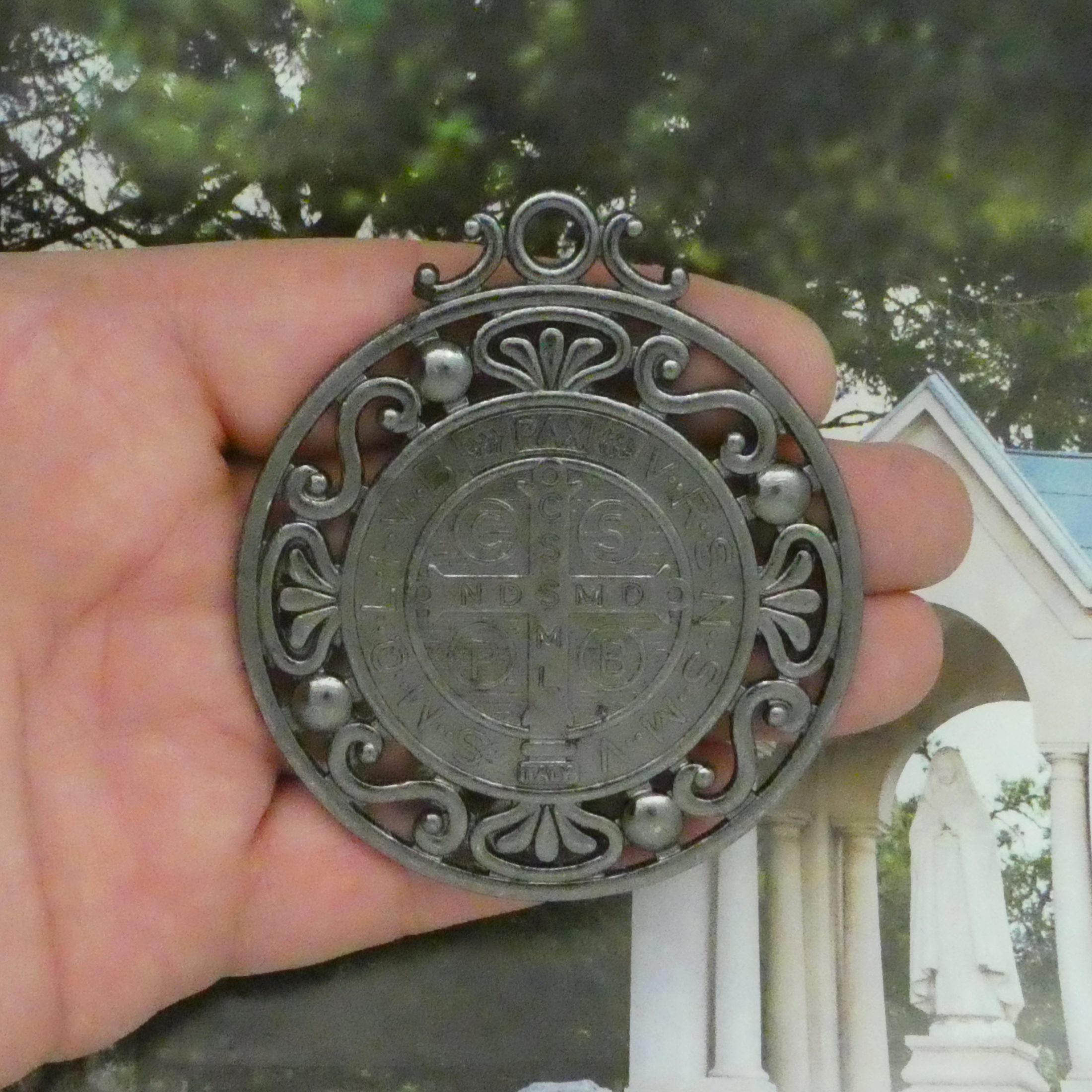 The St Benedict Medal Door Hanger Gunmetal Large is a beautiful and unique way to protect your home. This door hanger features the image of St Benedict, the patron saint of protection, on the front and a powerful prayer on the back. The medal is made of gunmetal plated pewter. Simply place this door hanger on any door in your home to enjoy the peace and protection of St Benedict.