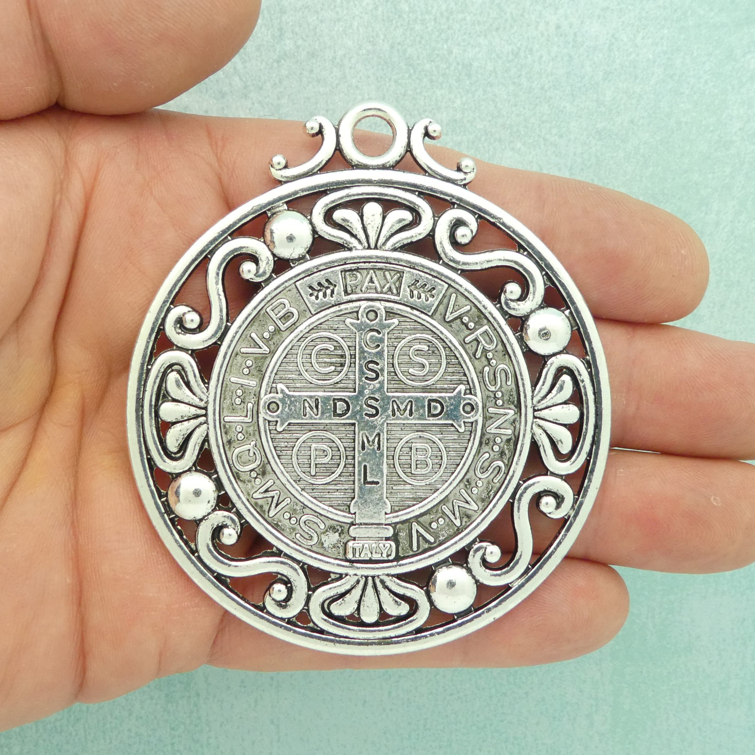 You will receive 1 – Silver Large St Benedict Medal double sided in Pewter 78mmx69mmx4mm by TIJC. These charms are a quality Pewter for all your jewelry and crafting projects!