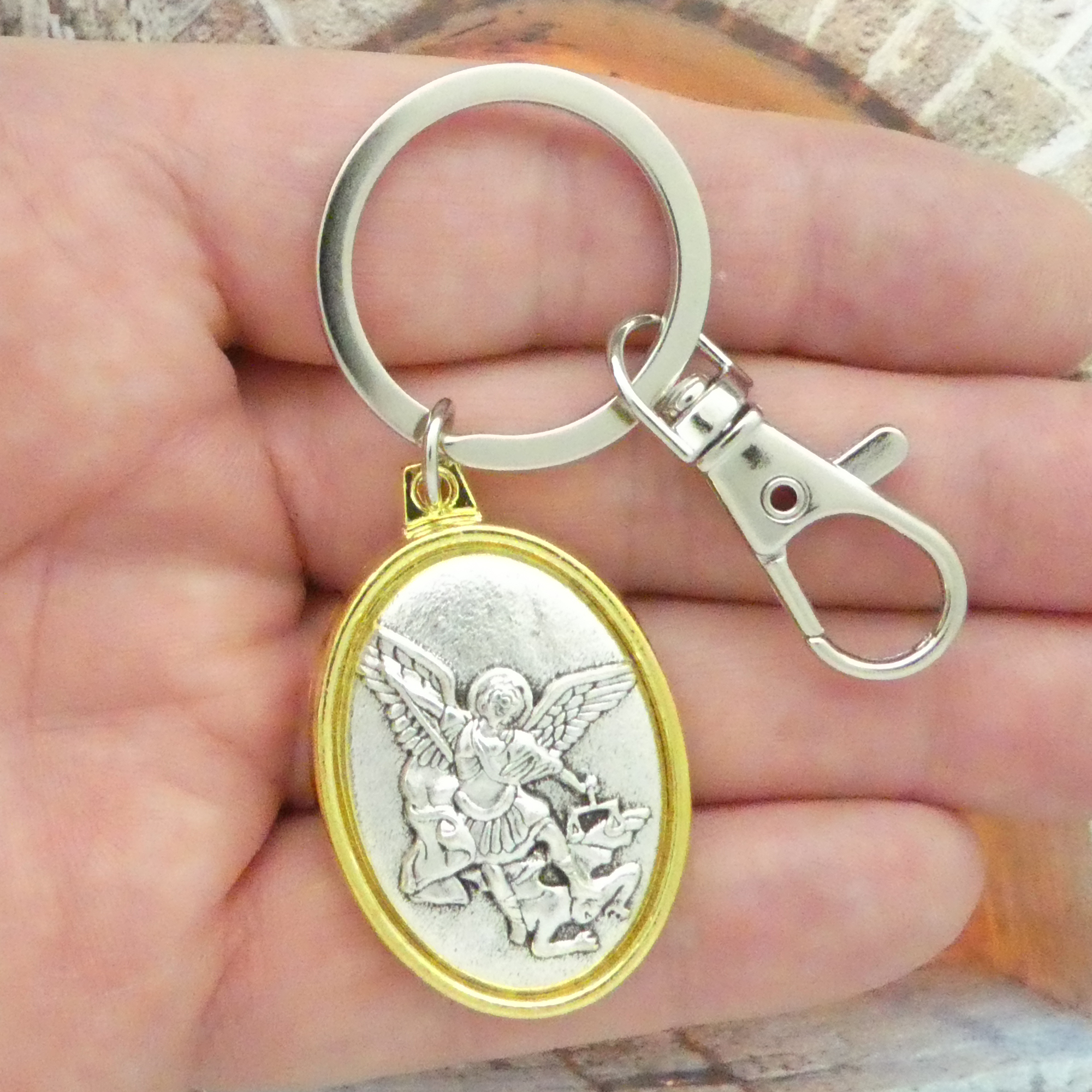 You will receive 1 – Our St Michael Keyring by TIJC! Makes the perfect St Michael pendant. This keychain is made from a quality Silver and Gold Pewter for all your jewelry and crafting projects!