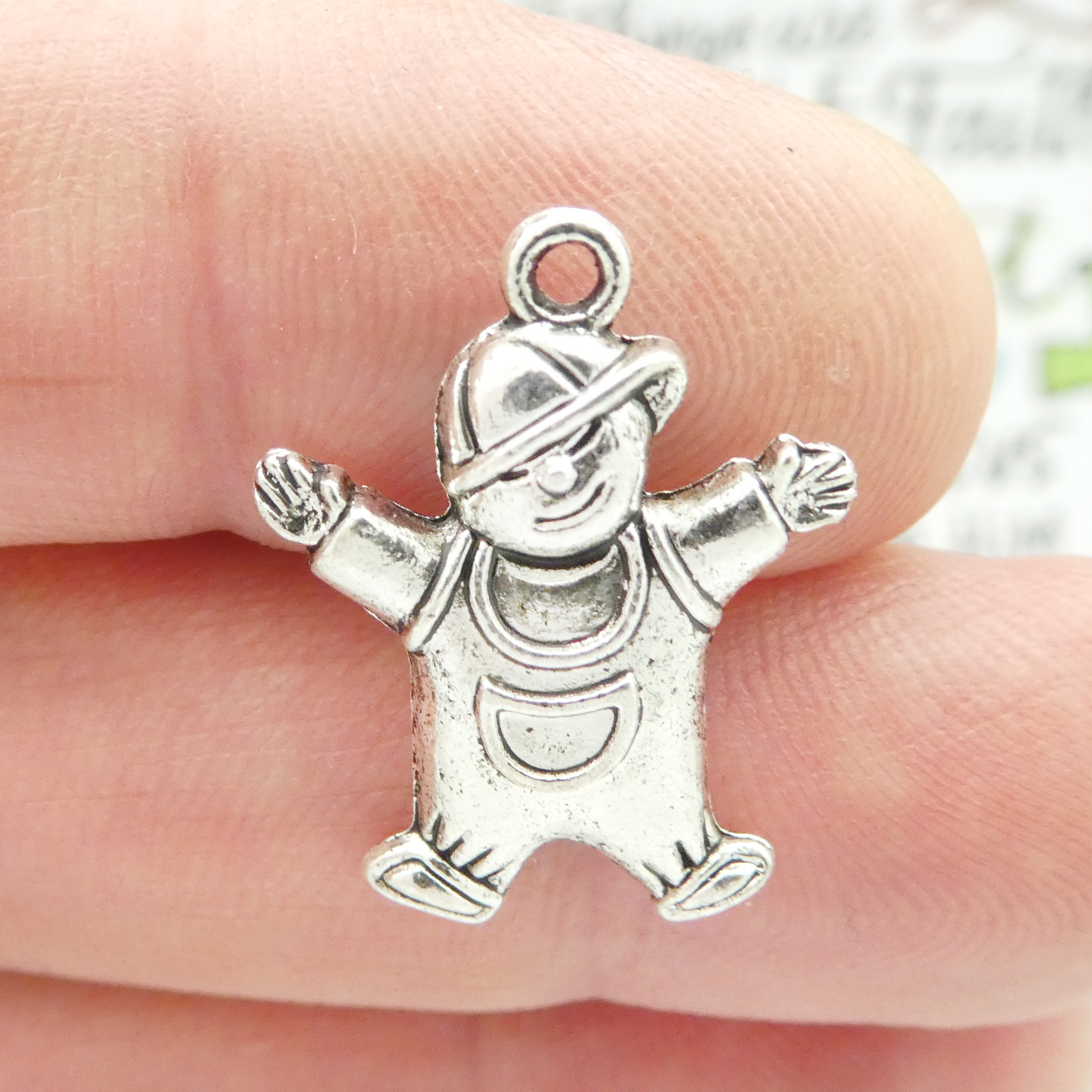 The pendant features the image of a little boy, which adds a touch of nostalgia and personal significance to the piece. The silver pewter material ensures that the charm has a timeless and sophisticated appearance, making it suitable for a wide range of jewelry designs and occasions.