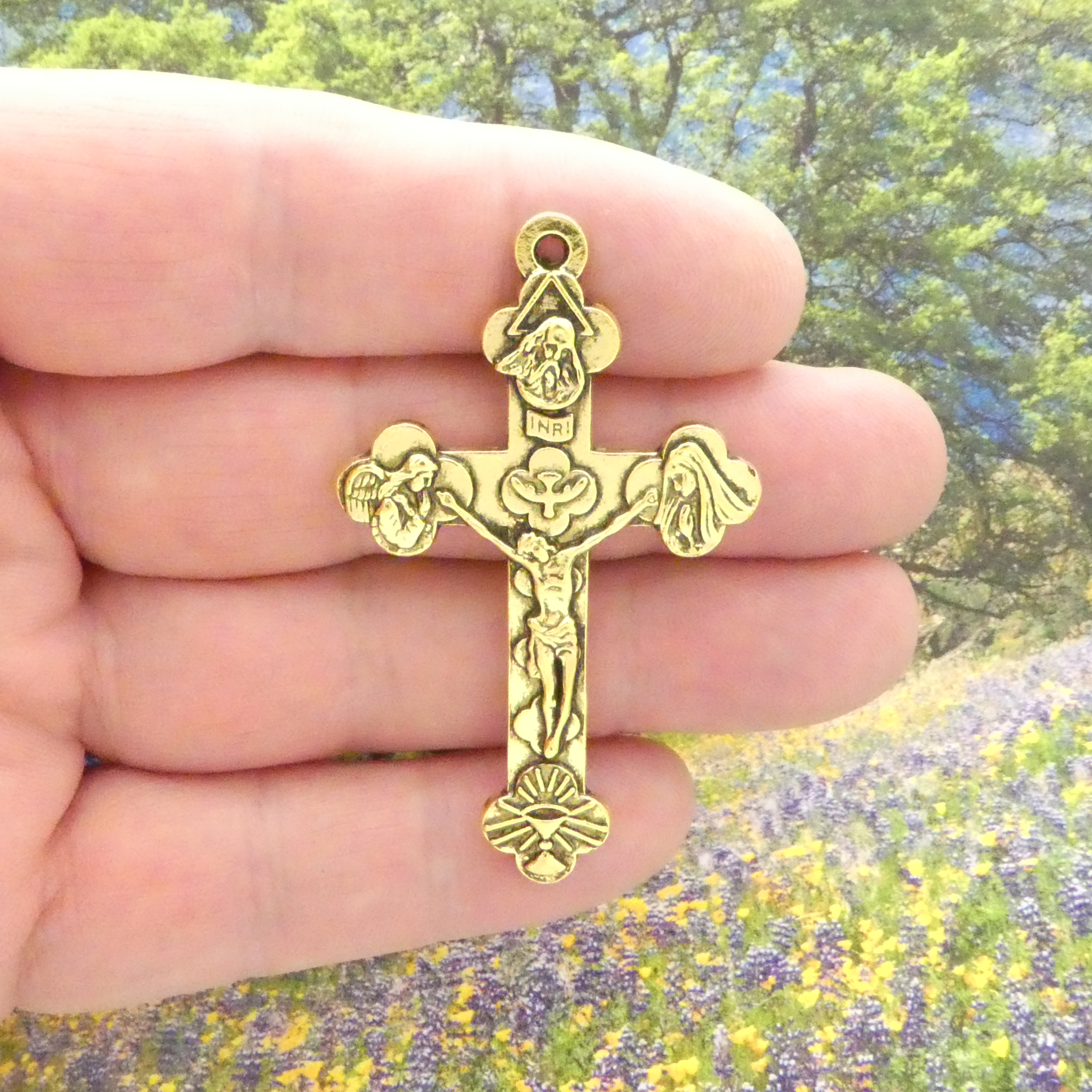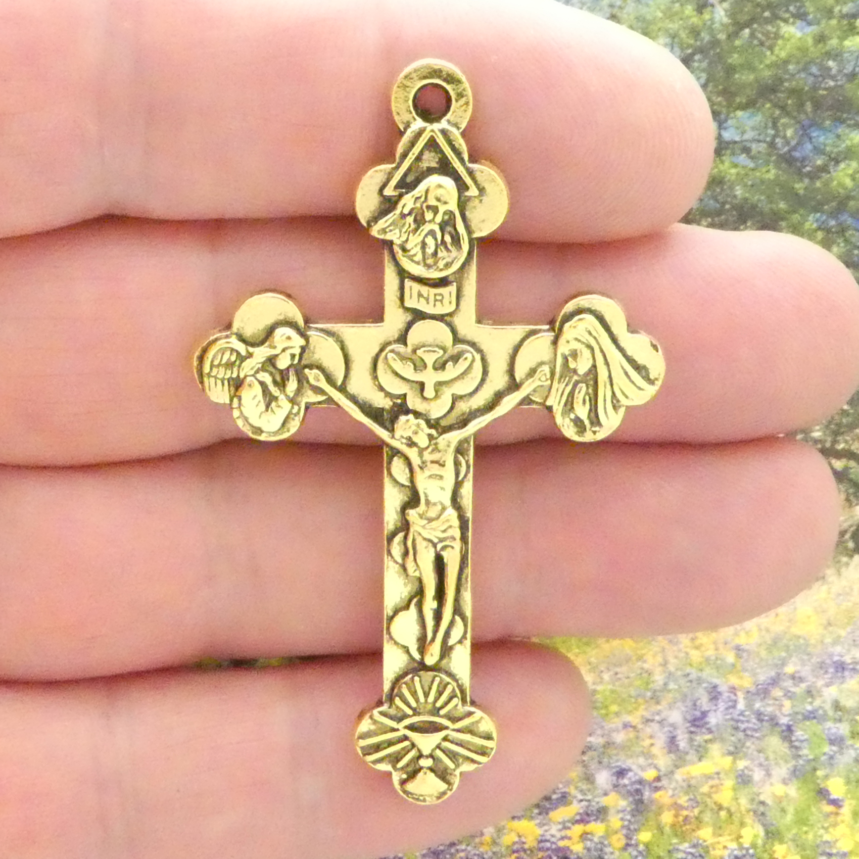 This beautiful crucifix pendant is the perfect way to show your faith. The gold holy trinity crucifix pendant is a stunning piece of jewelry that is sure to please anyone who sees it. The pendant features a cross with the three persons of the Holy Trinity, Jesus Christ, God the Father, and the Holy Spirit. This beautiful piece of jewelry is a great way to express your faith and would make a wonderful gift for anyone who is special in your life. This crucifix make a great addition to any rosary making project.