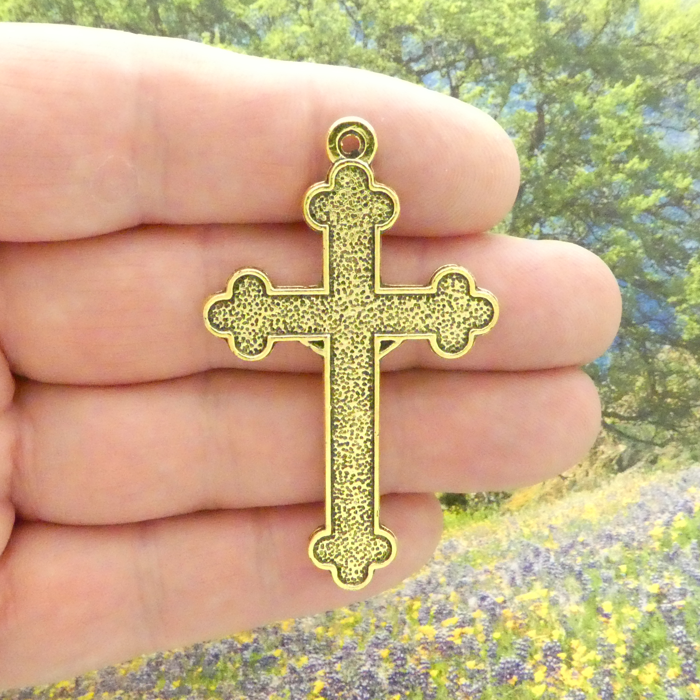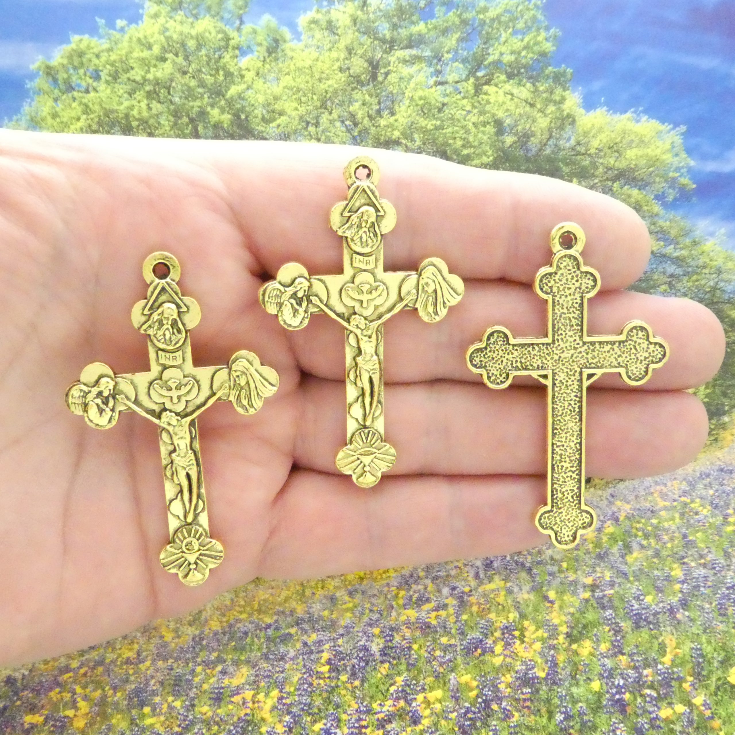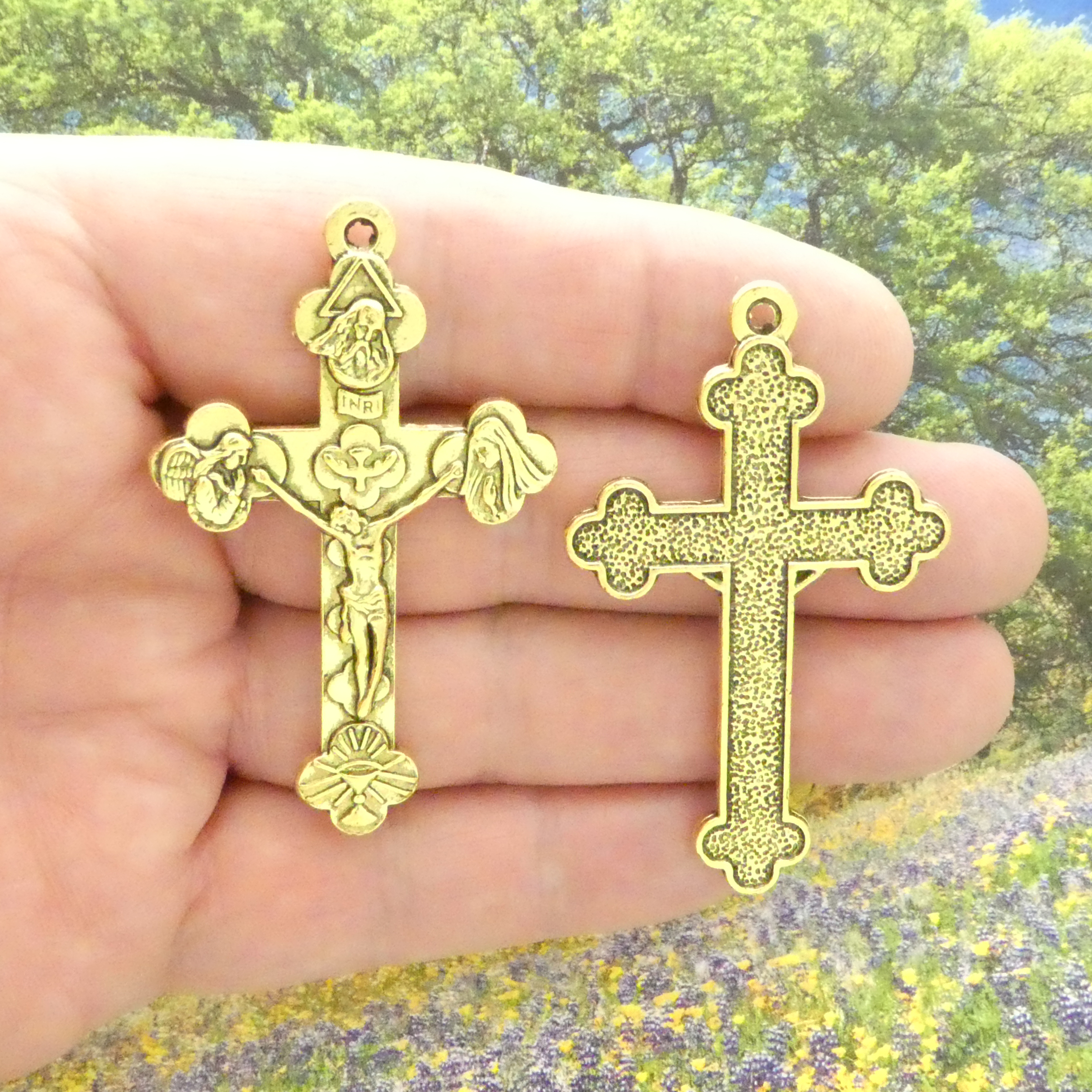 You will receive 2 – Large Gold Rosary Crucifix Cross Charms in Pewter 59x36x3mm by TIJC! Use this Antique Gold Pewter Cross for Rosary Parts in making a Catholic Rosary. These charms are a quality Gold Pewter for all your jewelry and crafting projects!