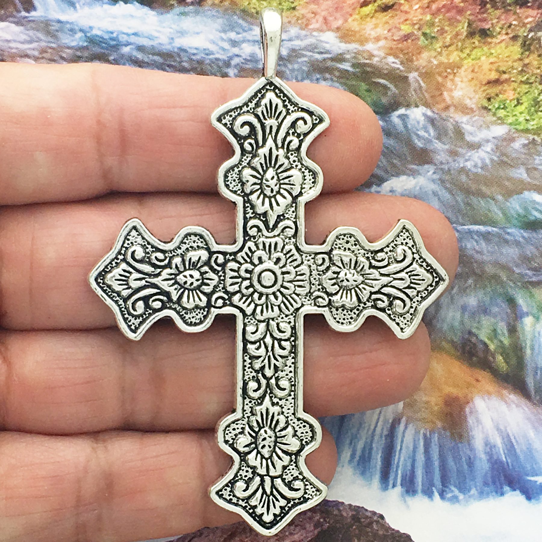 You will receive 2 – Ornate Large Silver Cross Charms with Flower Accents in Antique Silver Pewter. These charms are a quality Silver Pewter for all your jewelry and crafting projects!
