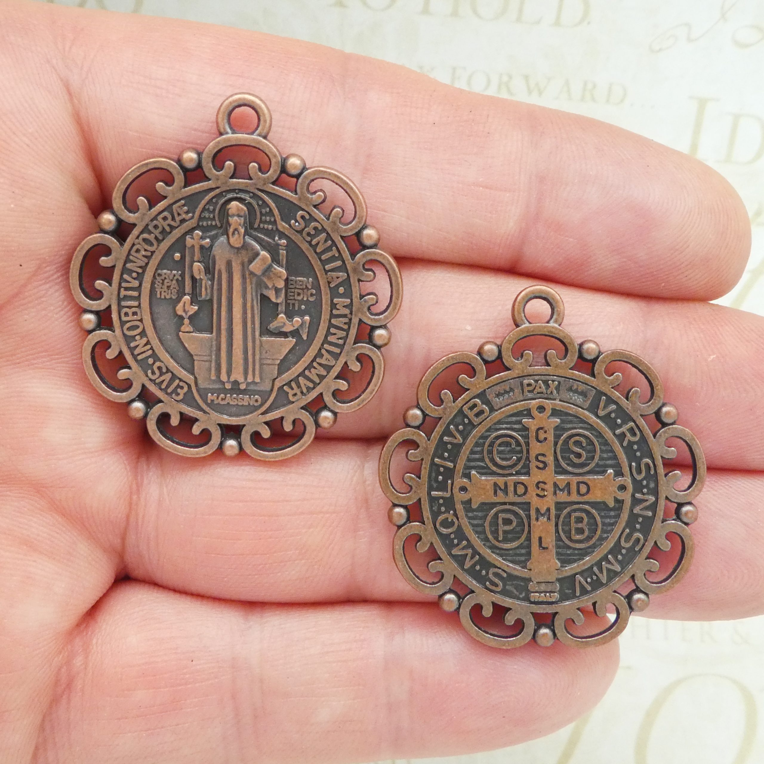You will receive 2 – Copper Medium St Benedict Medal with Scroll Accent in Pewter by TIJC. These charms are a quality Pewter for all your jewelry and crafting projects!