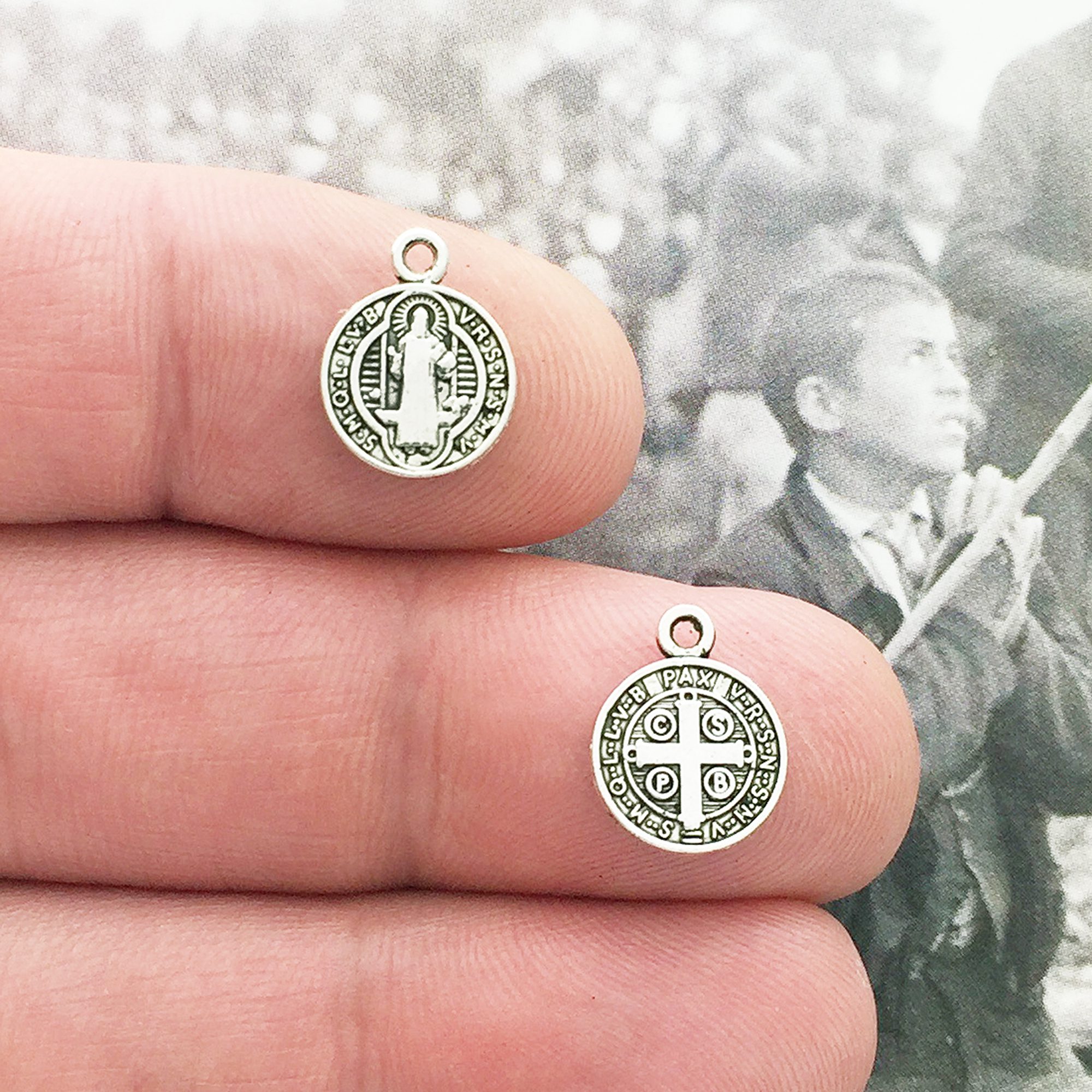 You will receive 20 – Silver Tiny St Benedict Medal by TIJC. These charms are a quality Silver Pewter for all your jewelry and crafting projects!