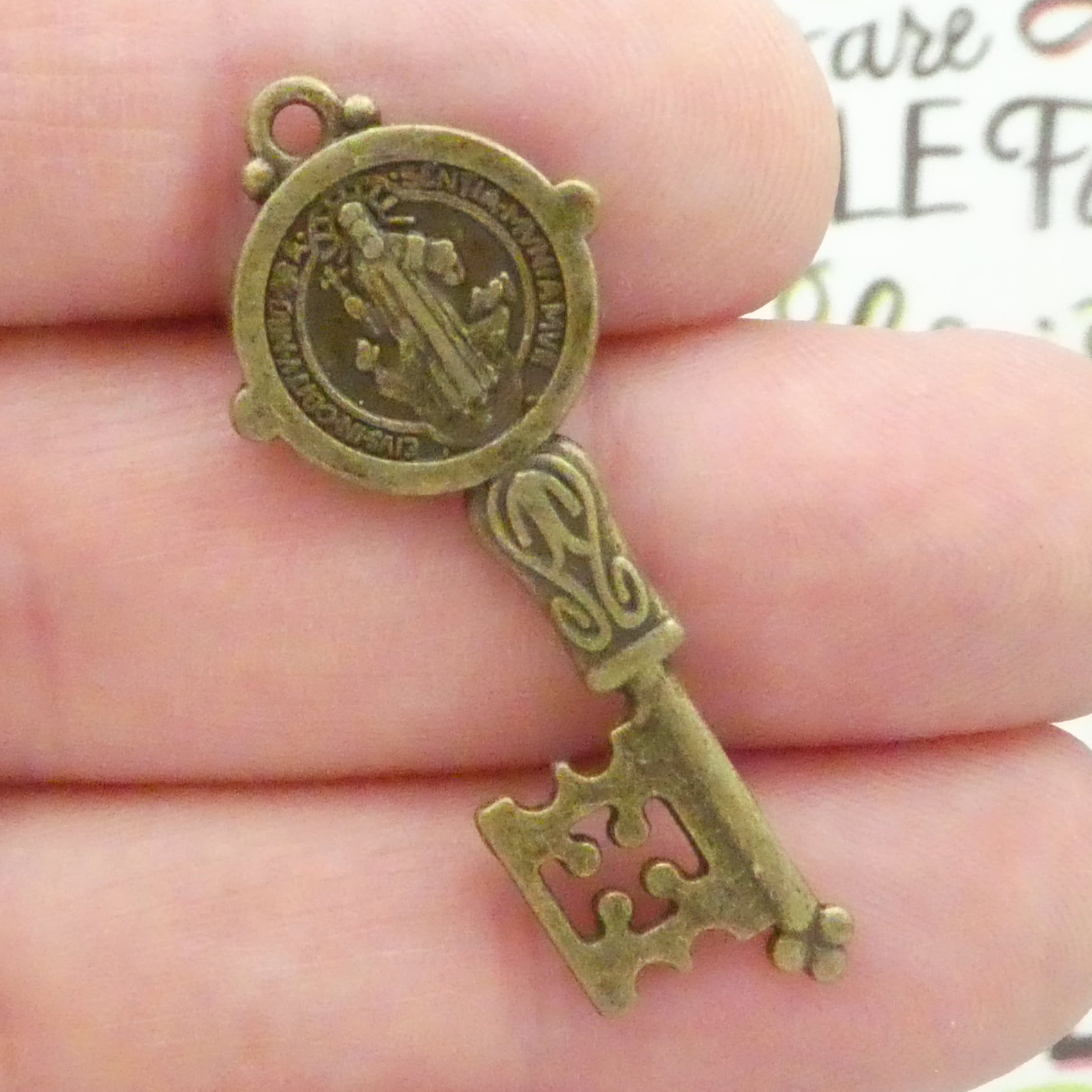 This medal is a key charm with a St. Benedict Medal. It can be used as a keychain or a zipper pull. The St. Benedict Medal is a Christian medal that is used as a sacramental against evil. It is also used to bless people, places, and things.