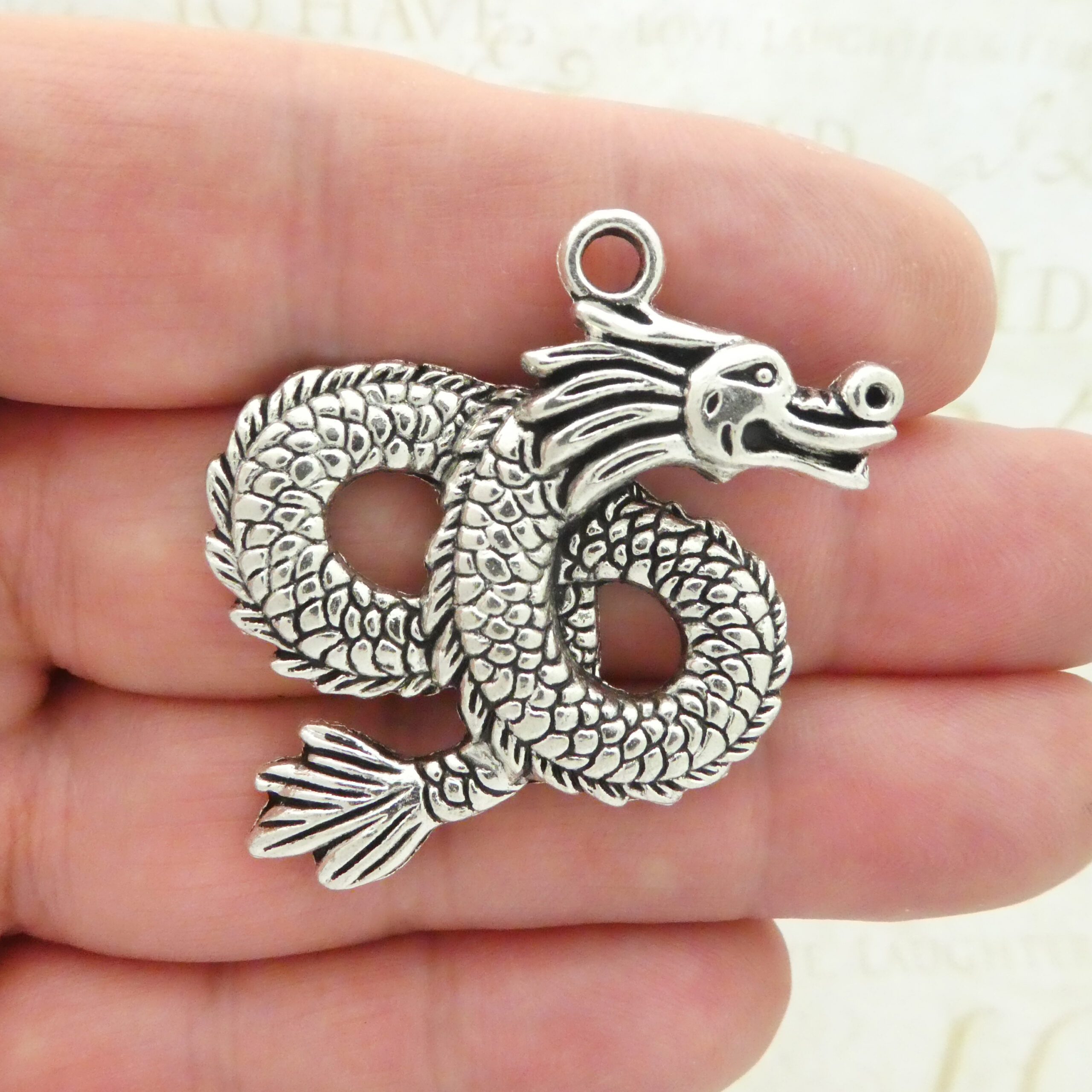 You will receive 3 – Large Chinese Dragon Charm Pendant in Silver Pewter Pendant. These charms are a quality Silver Pewter for all your jewelry and crafting projects!