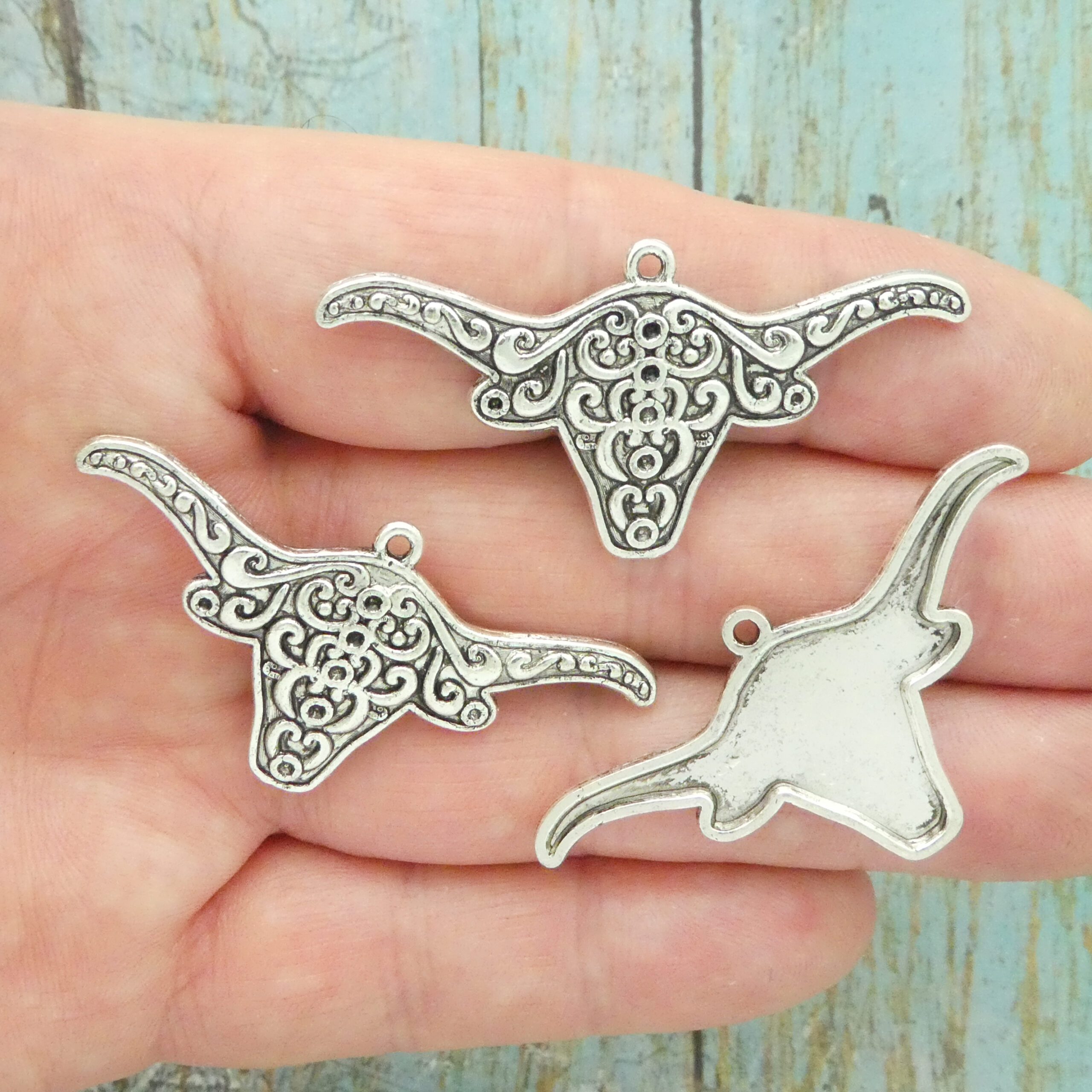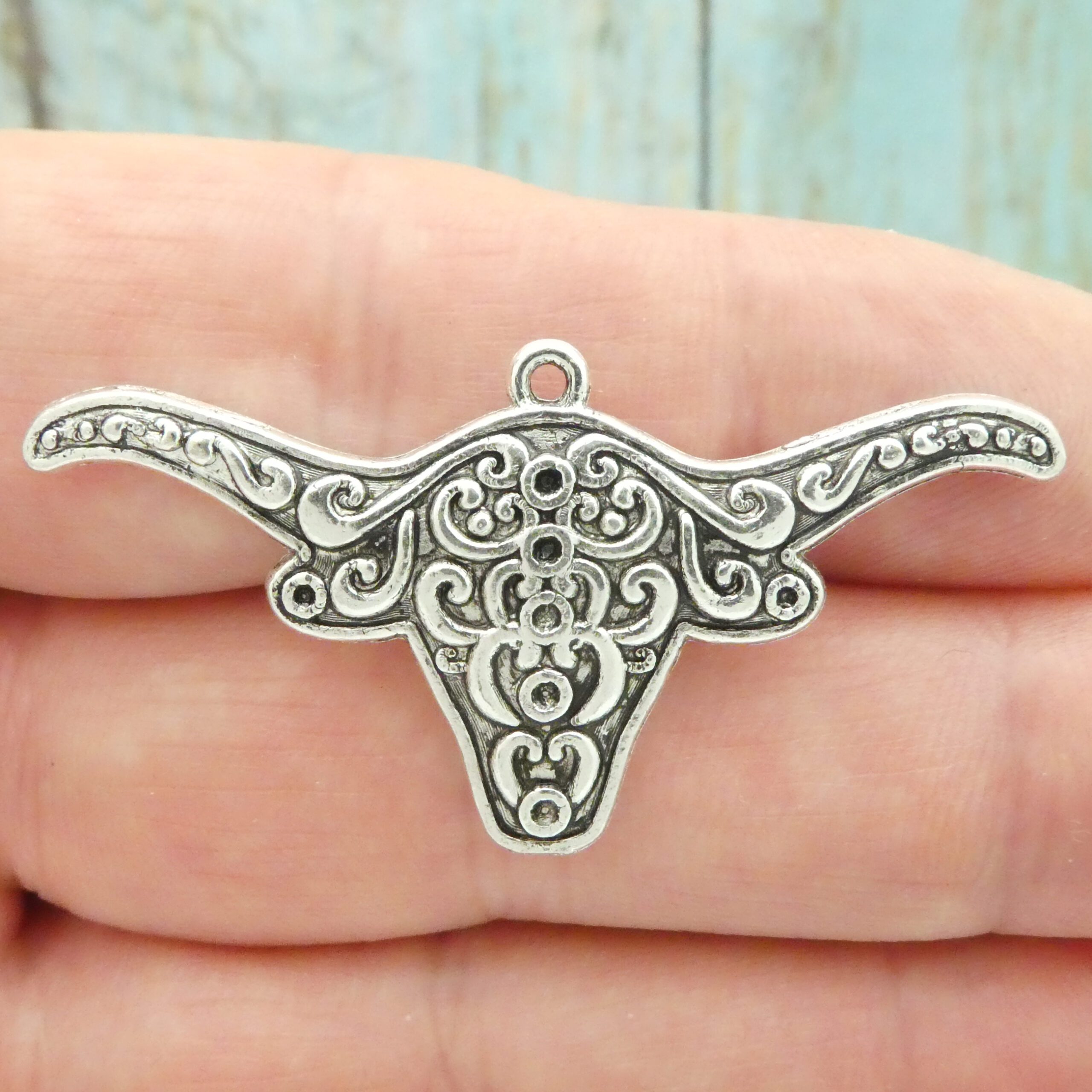 You will receive 3 – Ornate Longhorn Pendant in Silver Pewter! These charms are a quality Silver Pewter for all your jewelry and crafting projects!
