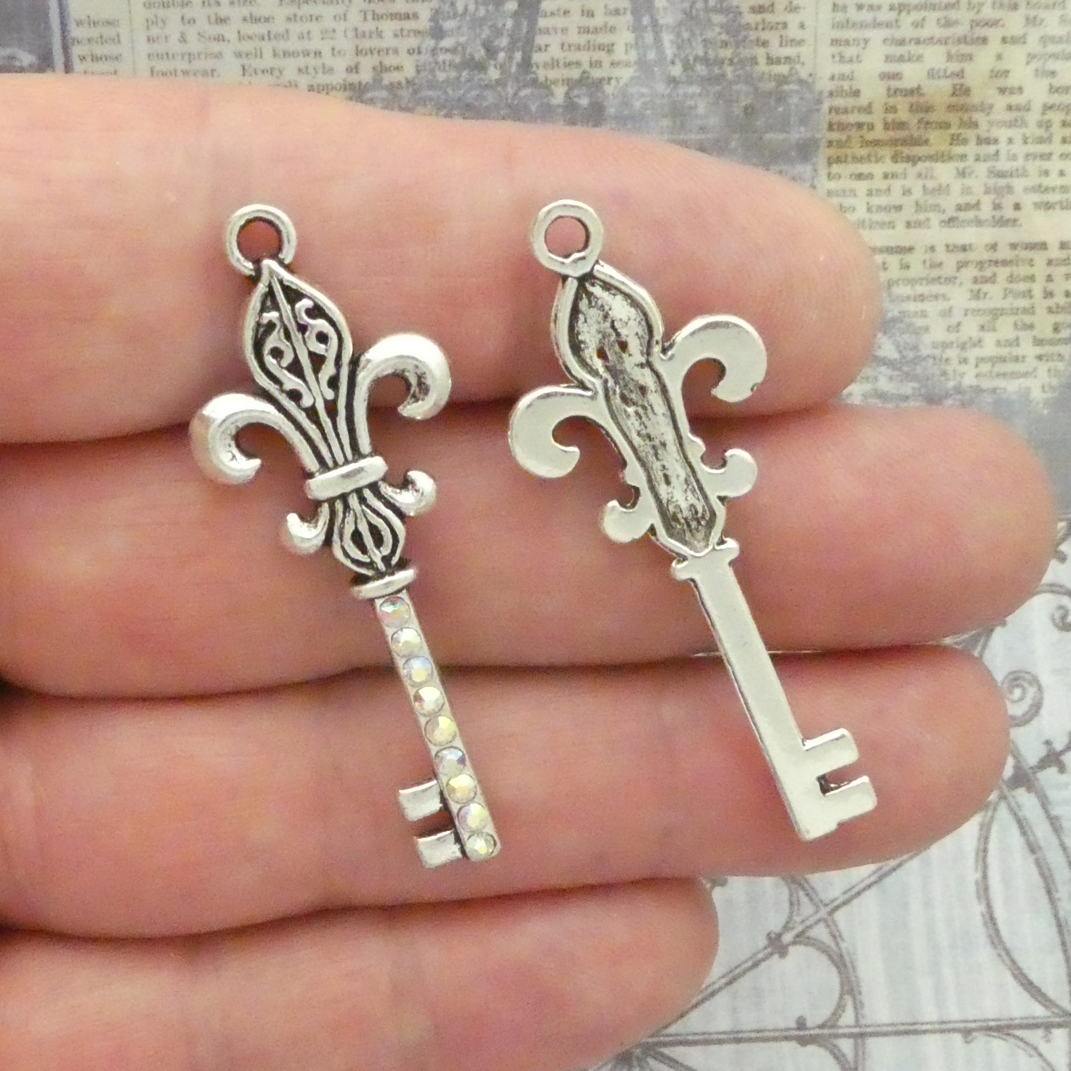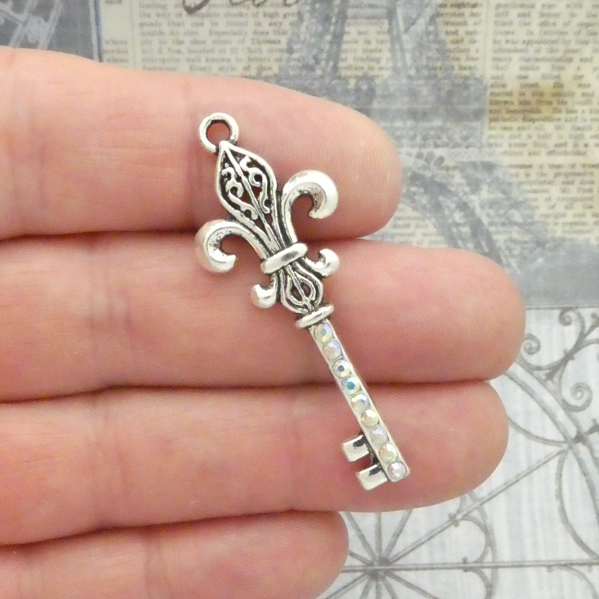 You will receive 4 – Fluer De Lis Key Charms wit AB Crystal Accents in Antique Silver Pewter by TIJC! These charms are a quality Silver Pewter for all your jewelry and crafting projects!