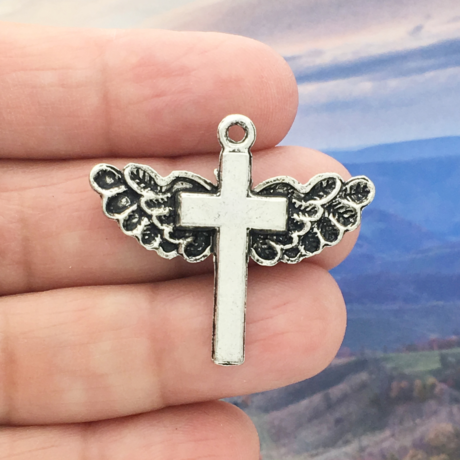 You will receive 5 – Angel Wing Charm with Cross in Antique Silver Pewter 29x34mm by TIJC. These charms are a quality Silver Pewter for all your jewelry and crafting projects!