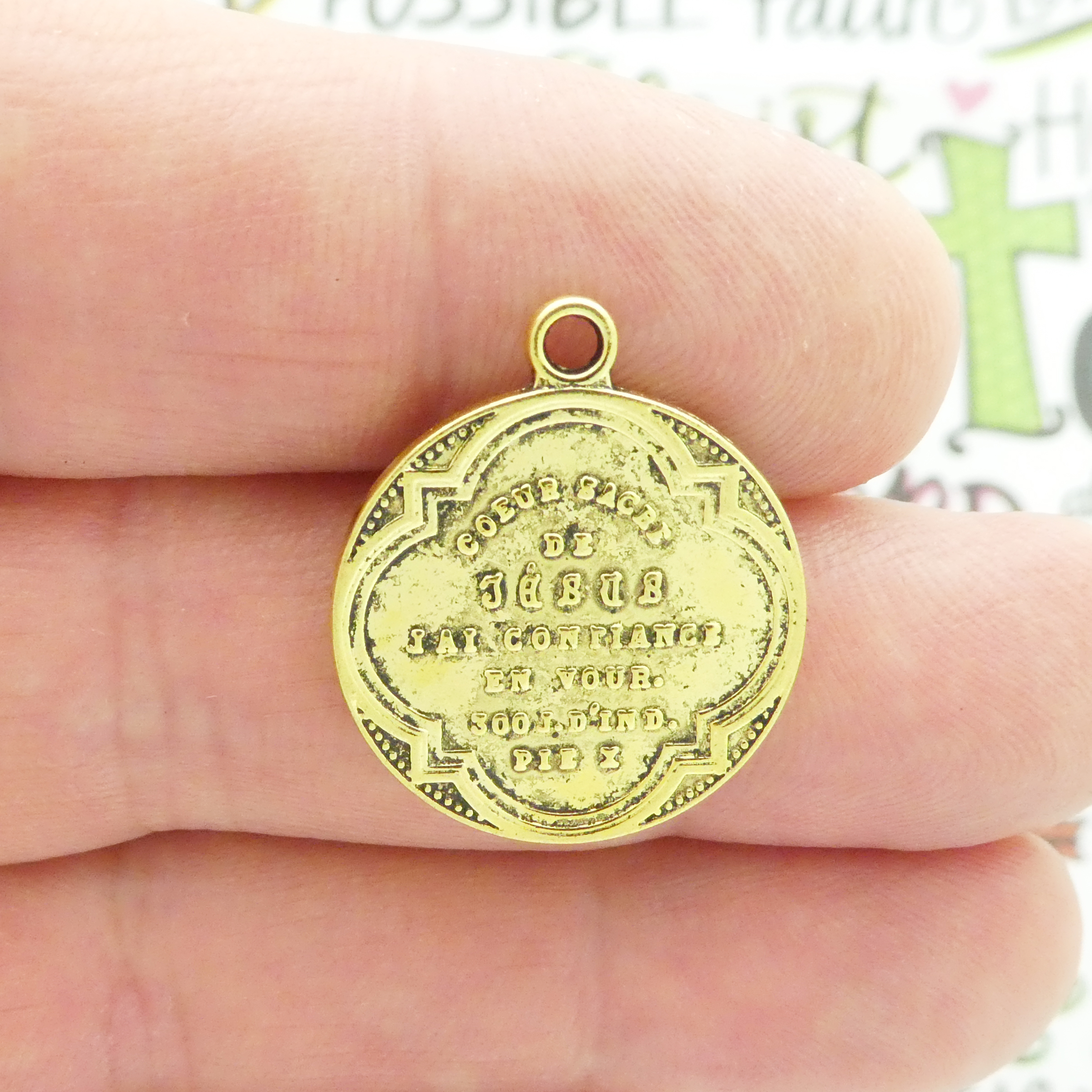 You will receive 5 – Round Sacred Heart of Jesus Medal Pendant in Gold Pewter. These charms are a quality Pewter for all your jewelry and crafting projects!