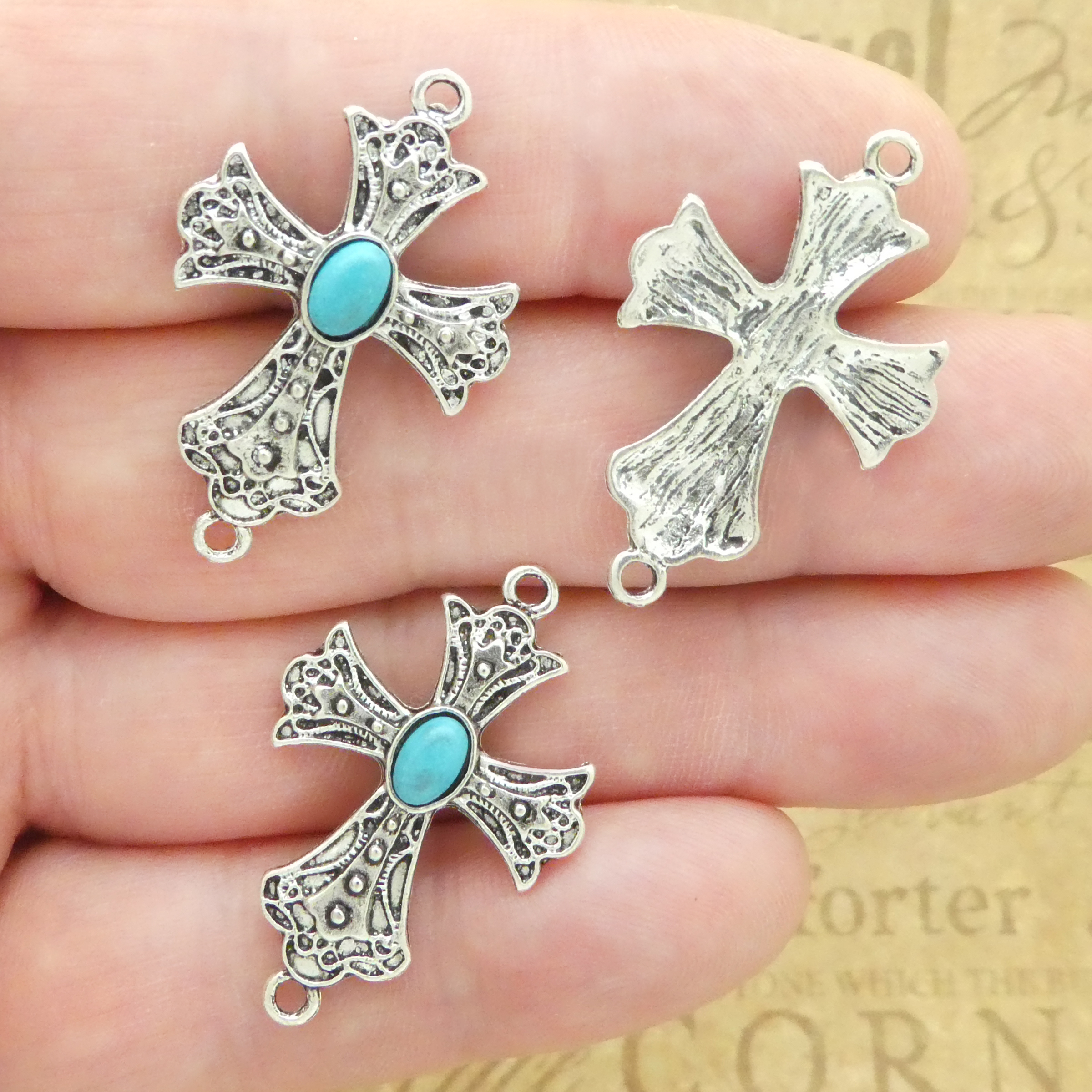 You will receive – Sideways Cross Bracelet Connector with Turquoise in Antique Silver Pewter 35x24x4mm by TIJC! These charms are a quality Silver Pewter for all your jewelry and crafting projects!