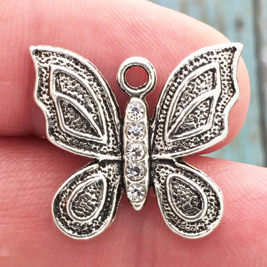You will receive 5 Ornate Butterfly Charms with Crystal Accents in Silver Pewter! These charms are a quality Silver Pewter for all your jewelry and crafting projects!