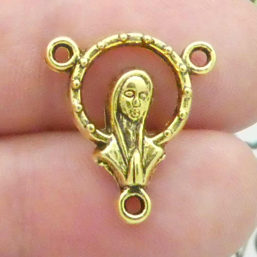 You will receive 6 – Jesus and Virgin Mary Rosary Supplies in Antique Gold Pewter by TIJC. These charms are a quality Pewter for all your jewelry and crafting projects!