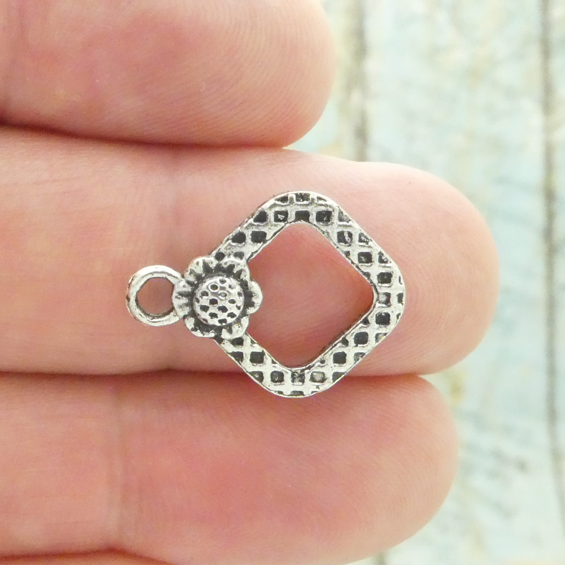 You will receive BULK 20 Sets – Small Diamond Toggle Clasp with Flower Accent in Antique Silver Pewter! These charms are a quality Silver Pewter for all your jewelry and crafting projects!