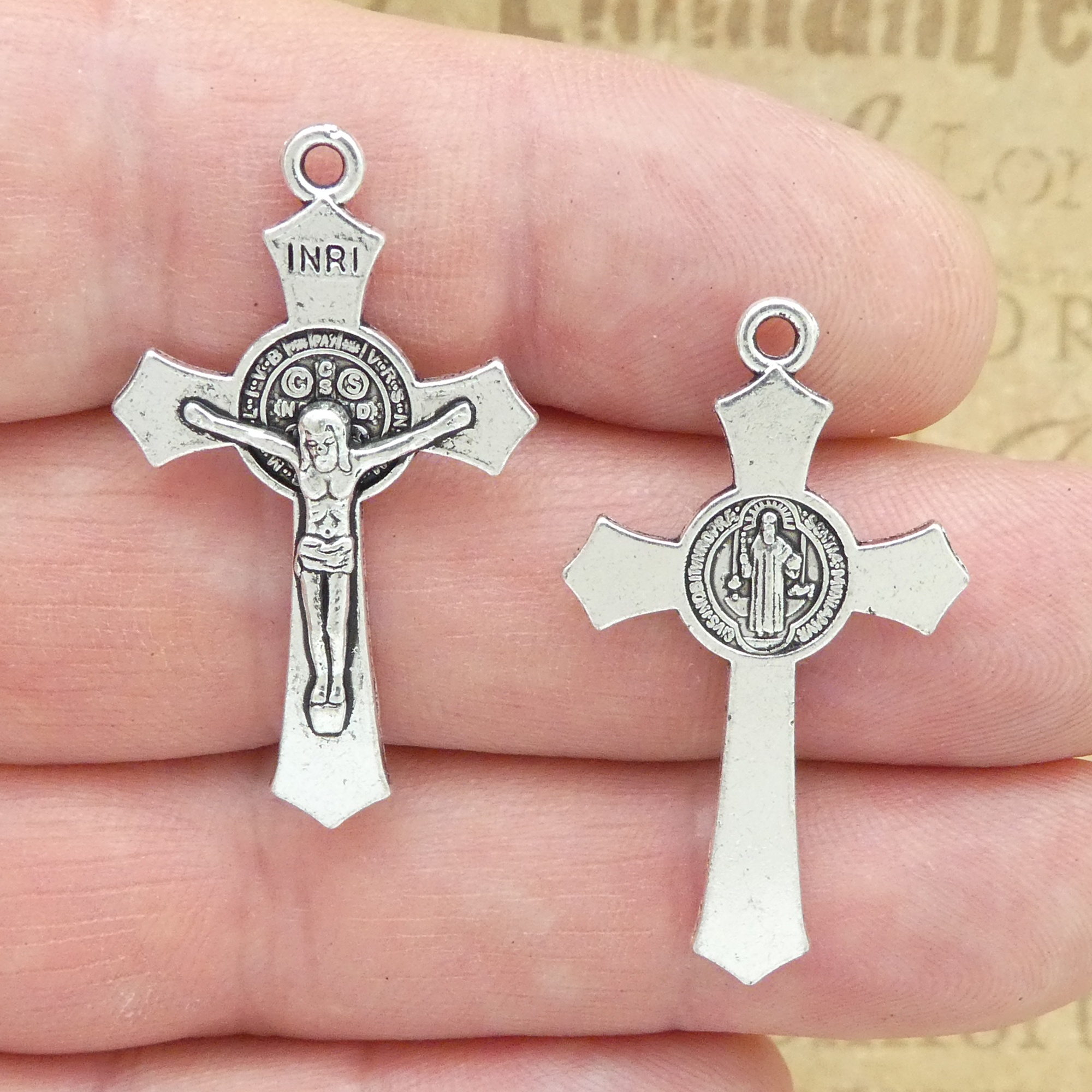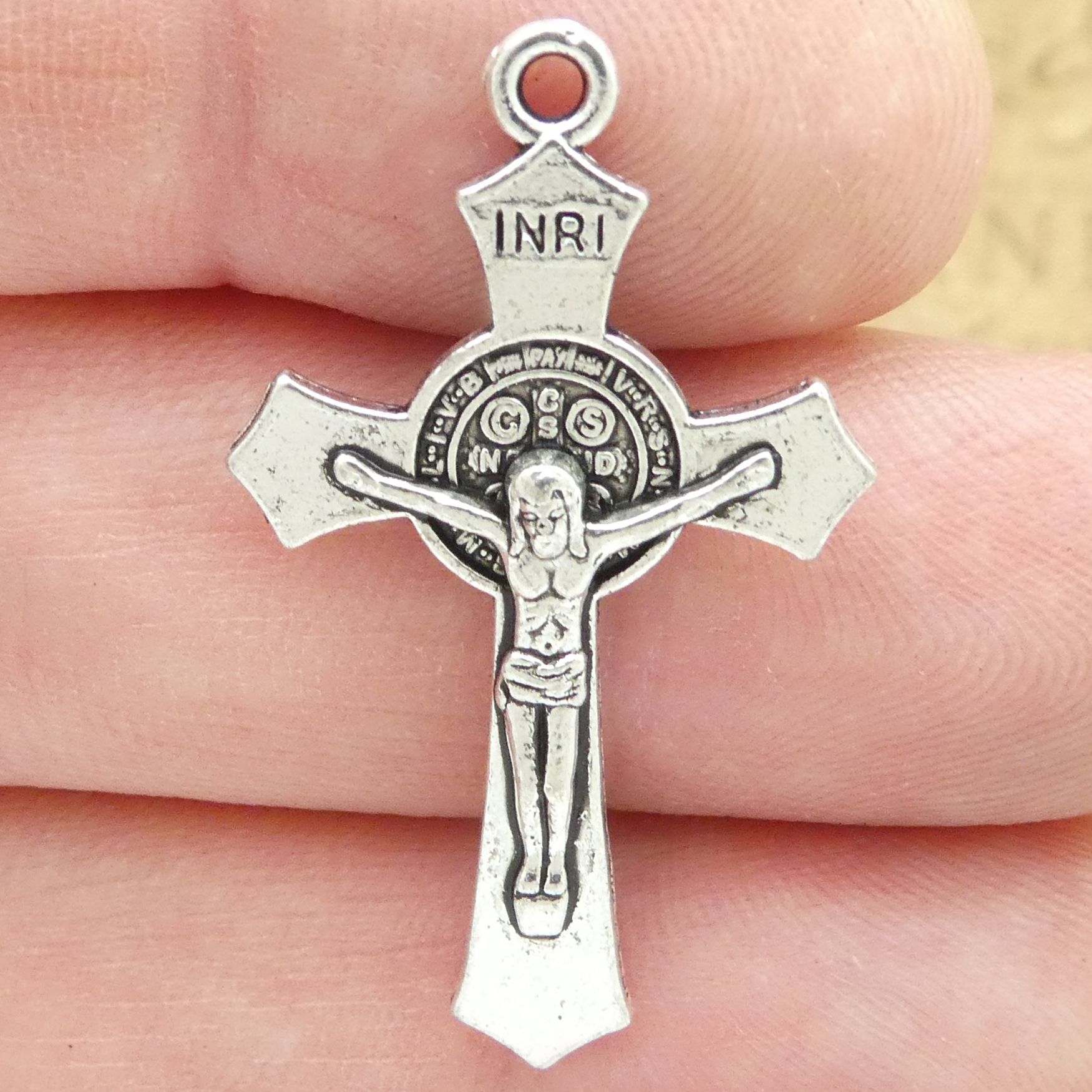 You will receive BULK 20 – Catholic Rosary Silver Cross Crucifix Charms with St Benedict in Antique Pewter! Use this Antique Silver Pewter Cross for Rosary Parts in making a Catholic Rosary. These charms are a quality Silver Pewter for all your jewelry and crafting projects!
