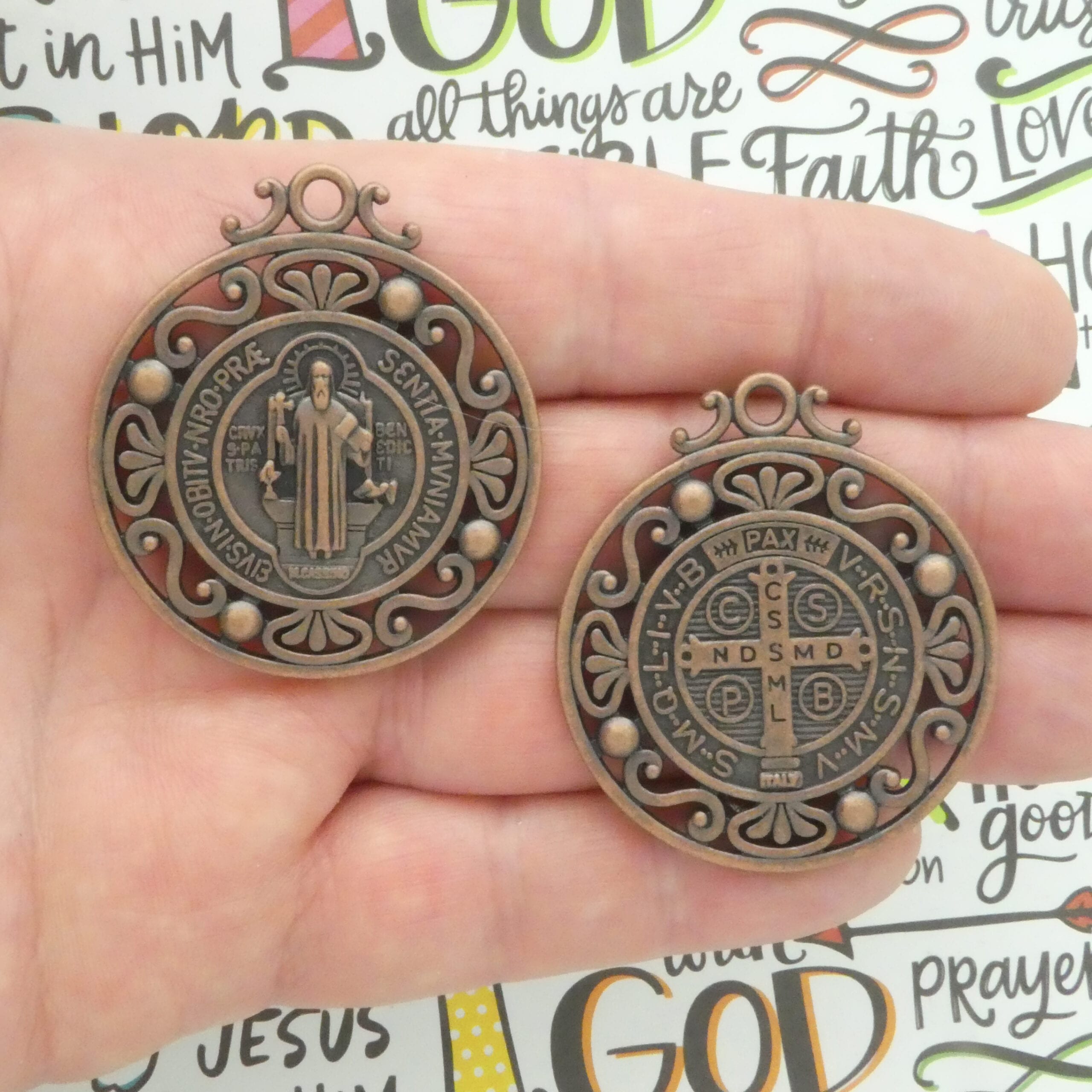 You will receive BULK 3 – Ornate Medium St Benedict Medal with Scroll Trim in Antique Copper Pewter. These charms are a quality Pewter for all your jewelry and crafting projects!