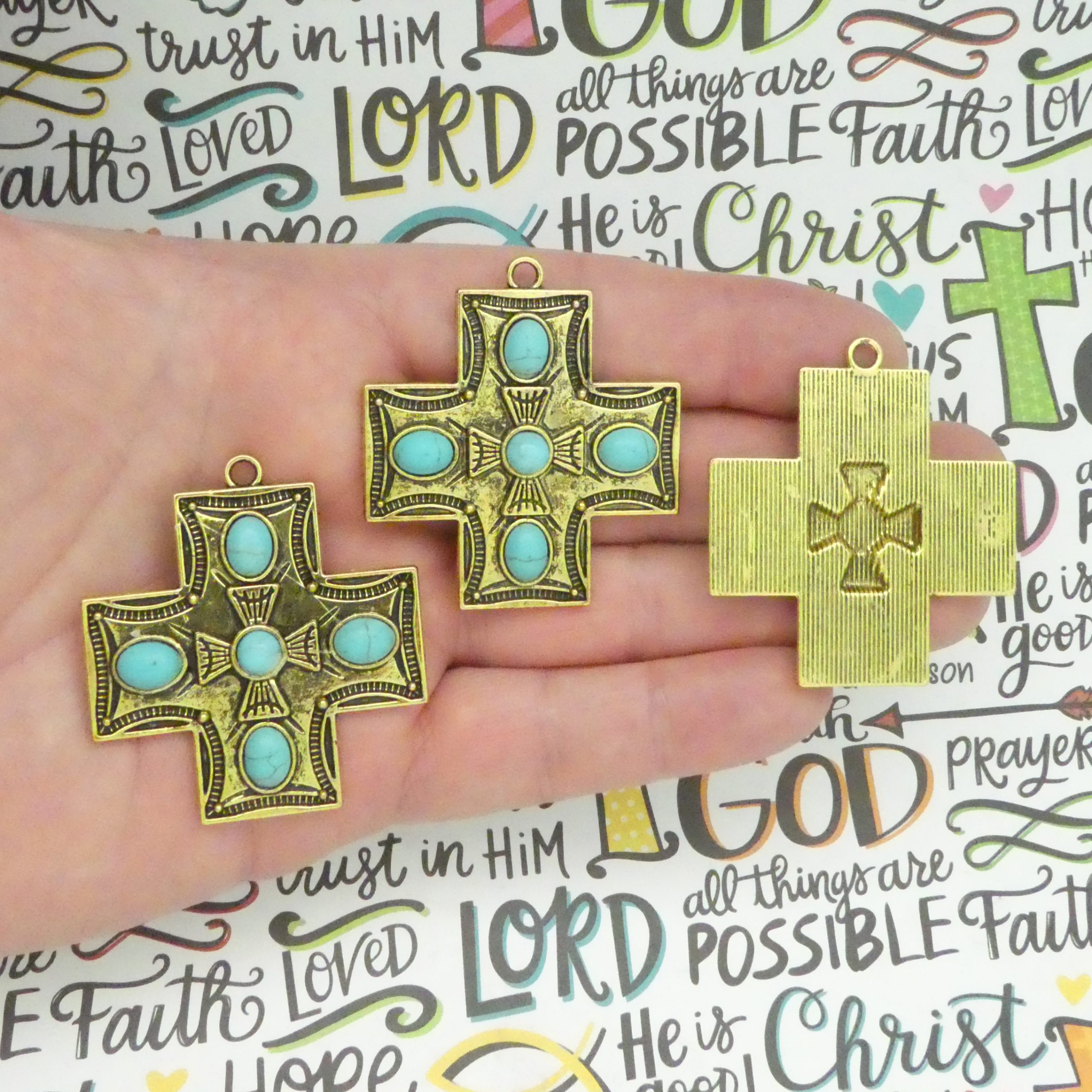 You will receive BULK 3 – Large Southwestern Cross Charm with Turquoise stones in Antique Gold Pewter 48x44mm by TIJC. These charms are a quality Pewter for all your jewelry and crafting projects!