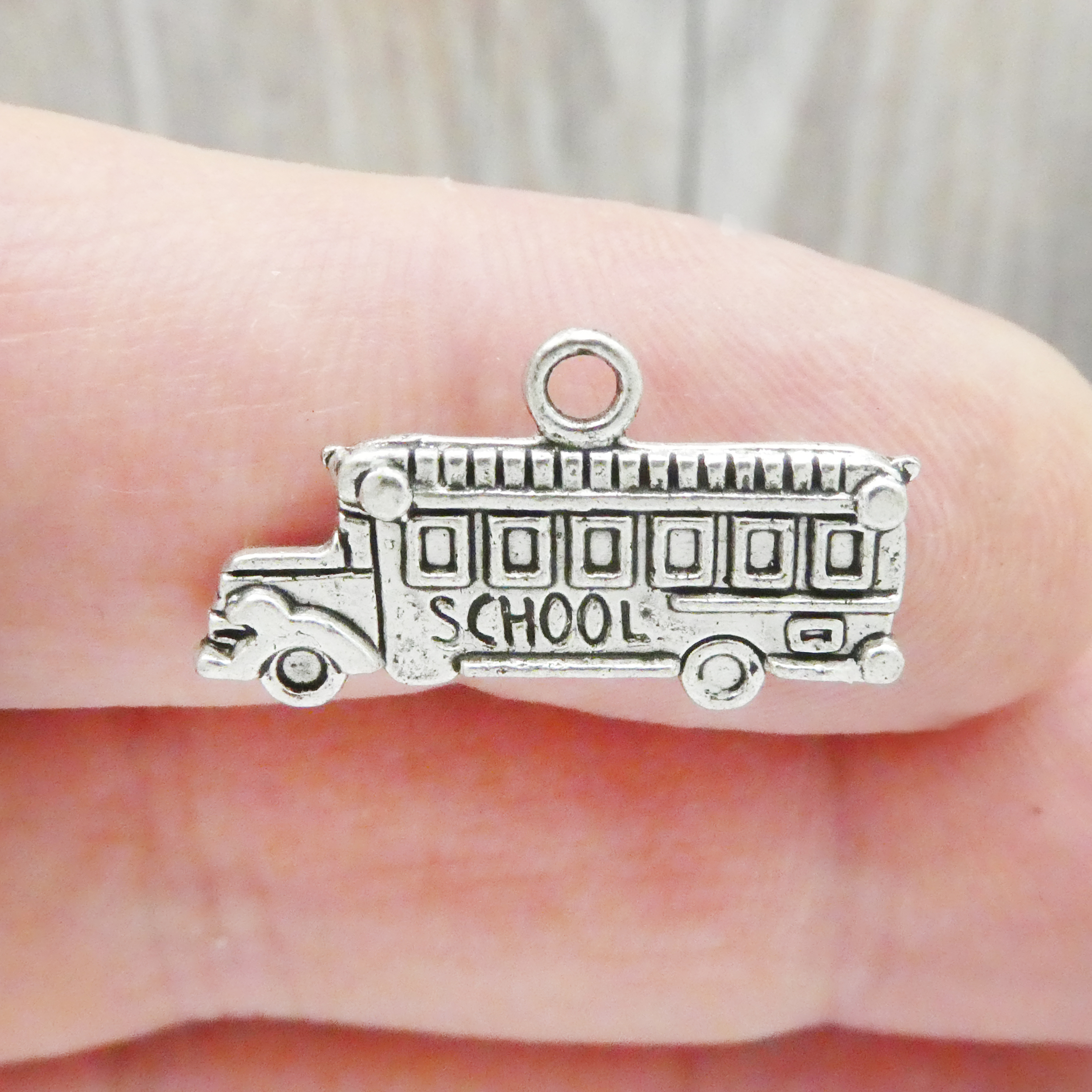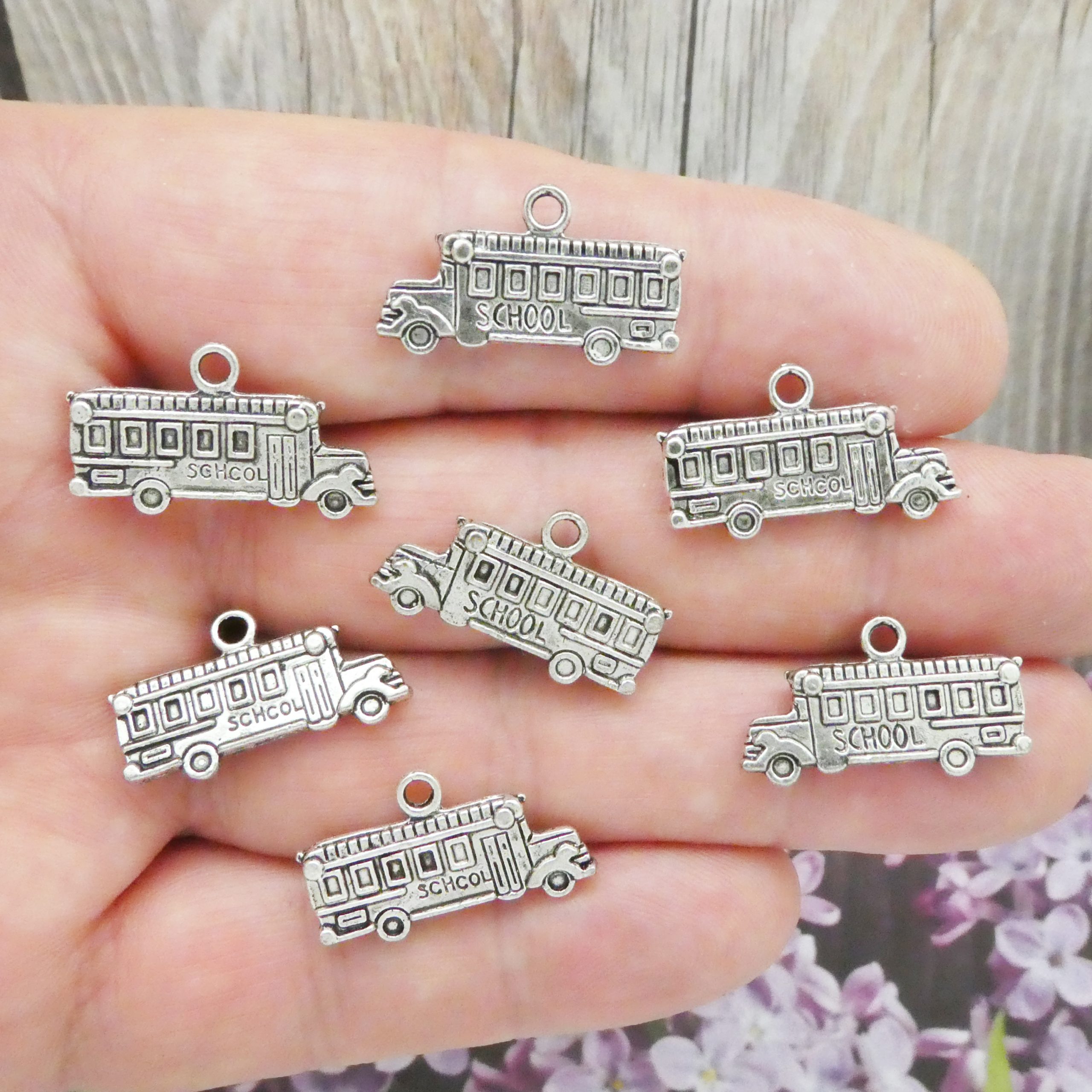 You will receive BULK 30 – Double Sided Silver School Bus Teacher Charms. These charms are a quality Silver Pewter for all your jewelry and crafting projects!