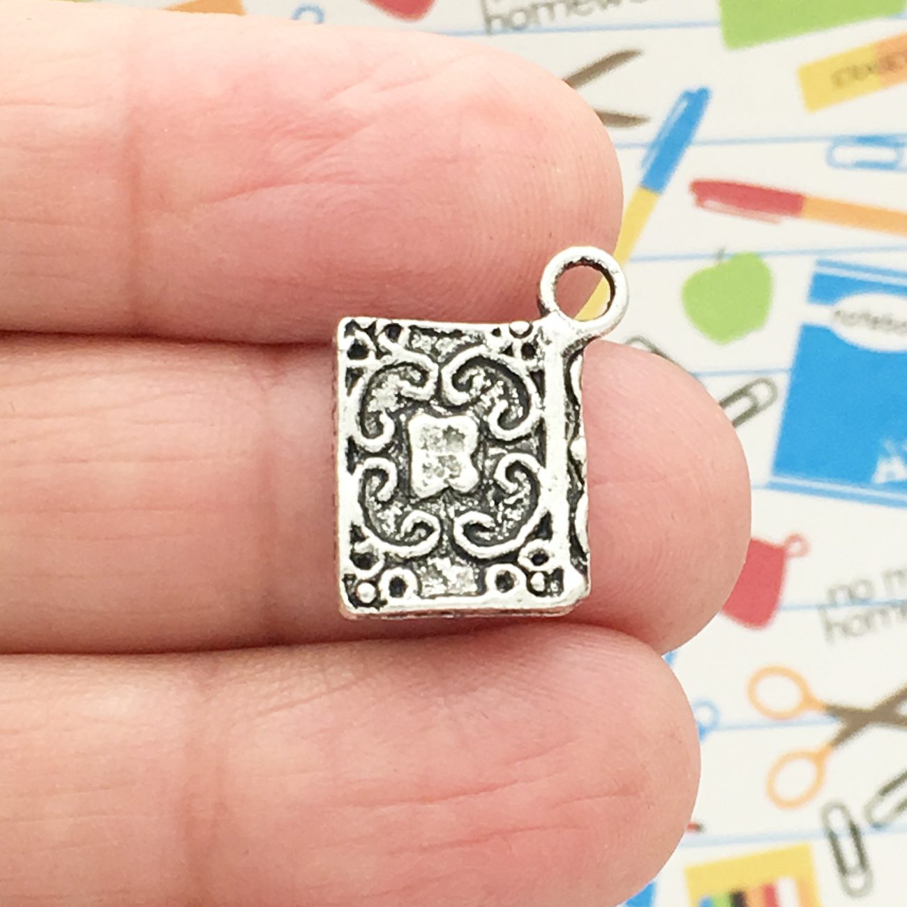 This book charm is the perfect way to add a touch of literary flair to any outfit. Whether you‘re dressing up for a day at the library or just want to show off your love of books, this charm is sure to get noticed. The ornate silver design is eye–catching and unique, making it a great conversation starter. Simply clip it onto your favorite bag or piece of jewelry and you‘re good to go!