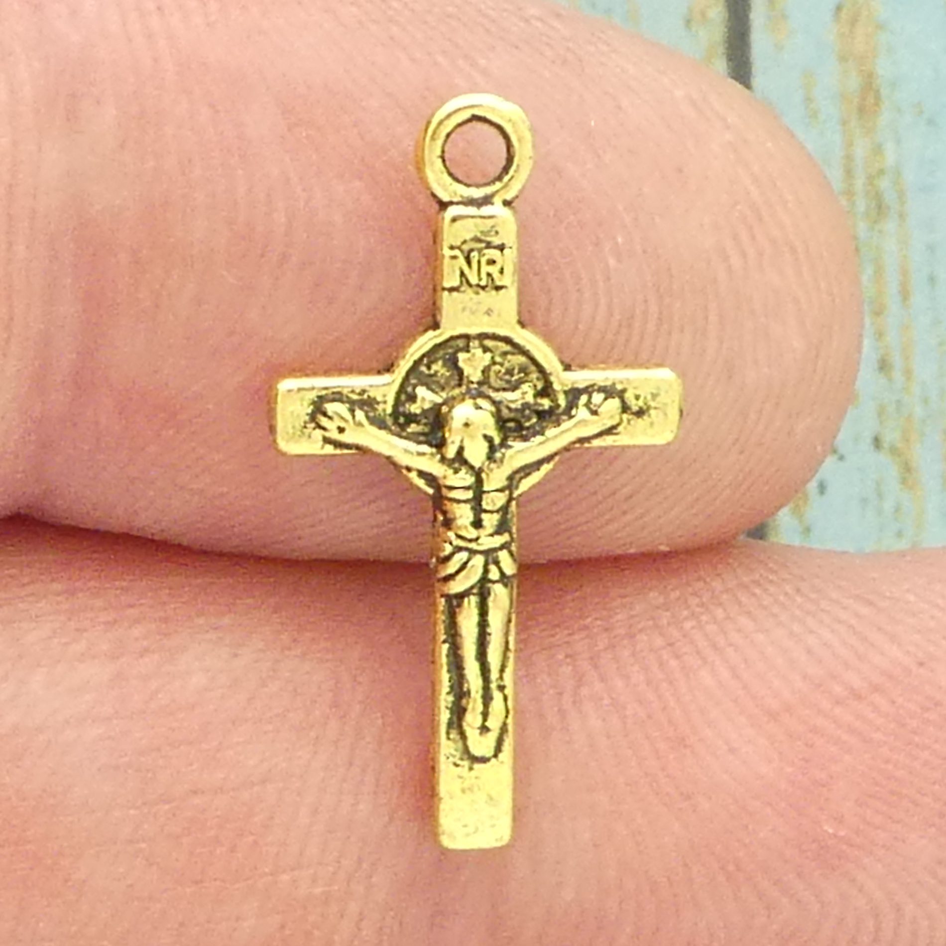 You will receive BULK 50 – Catholic Rosary Gold Cross Crucifix Charms with St Benedict in Antique Pewter! Use this Antique Gold Pewter Cross for Rosary Parts in making a Catholic Rosary. These charms are a quality Gold Pewter for all your jewelry and crafting projects!
