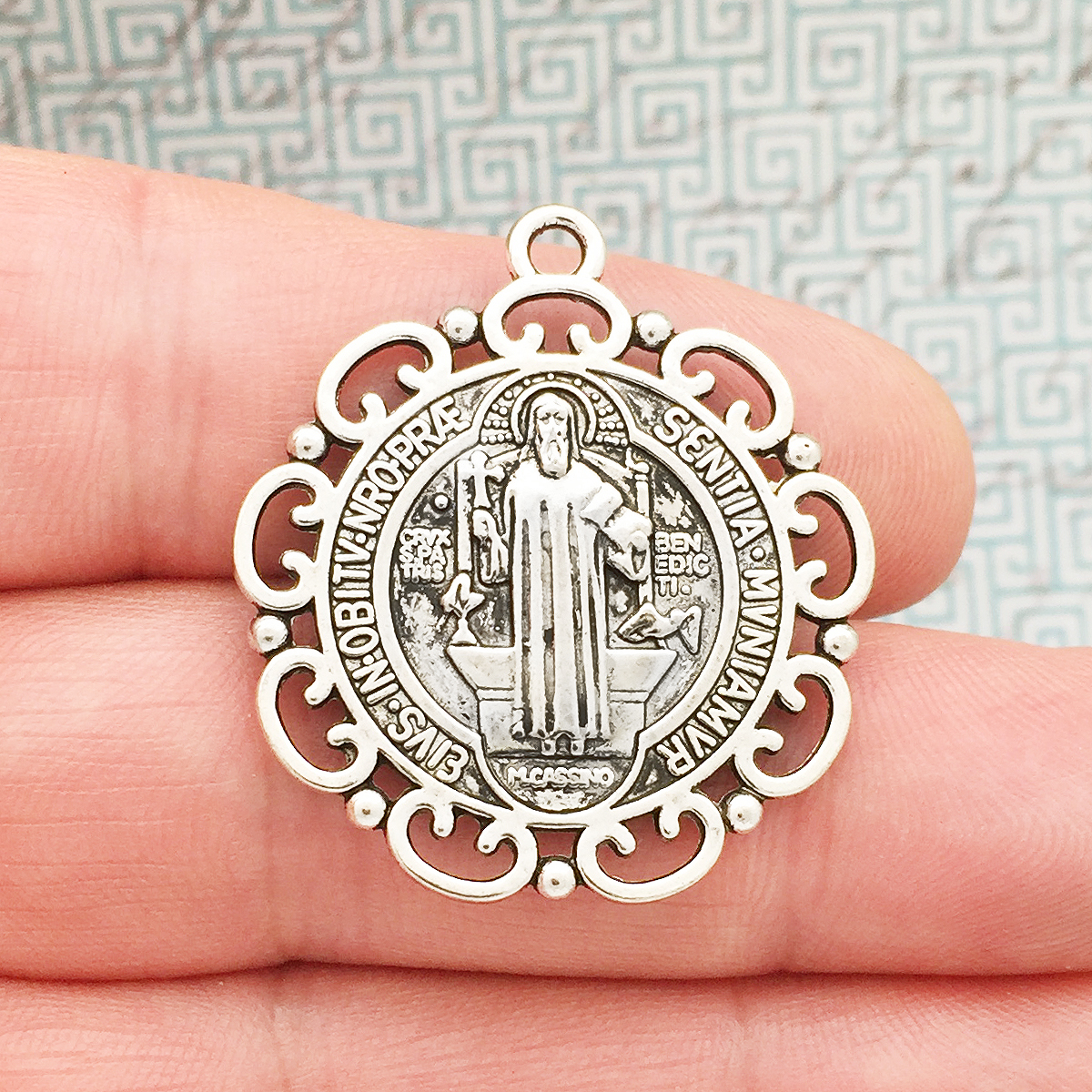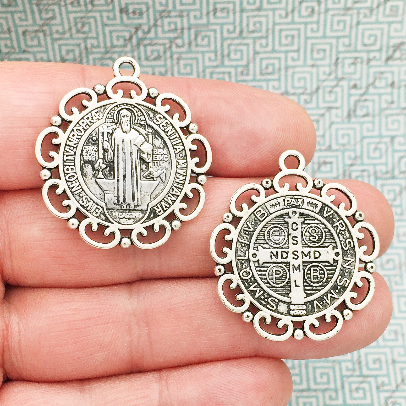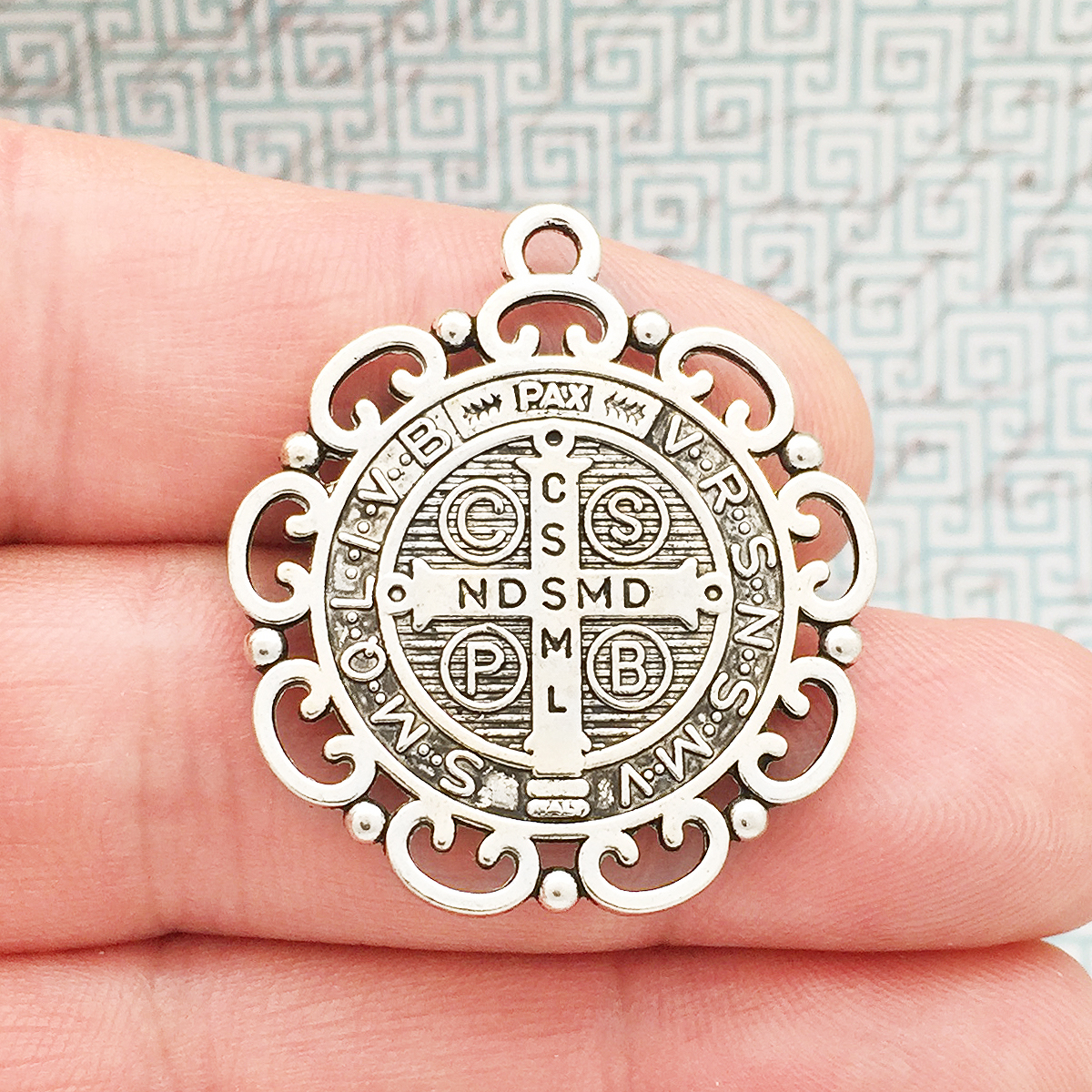 You will receive BULK 6 – Silver Medium St Benedict Medal with Scroll Trim in Antique Silver Pewter. These charms are a quality Silver Pewter for all your jewelry and crafting projects!