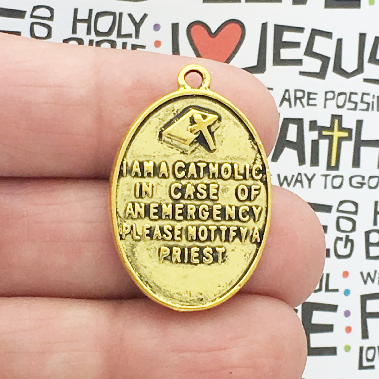 You will receive BULK 8 – Gold Crucifix Necklace Catholic Medal with Phrase “I am a Catholic in Case of an Emergency Please Notify a Priest” in Pewter by TIJC! These charms are a quality Pewter for all your jewelry and crafting projects!