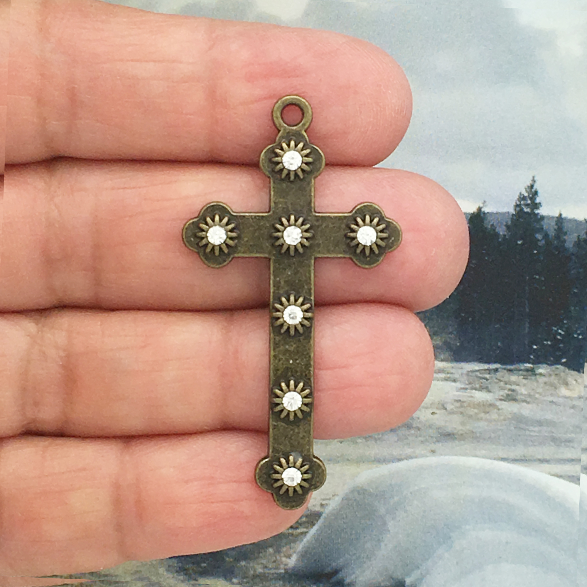 You will receive BULK 8 – Simple Large Cross Charms with Clear Crystal Accents in Antique Bronze Pewter. These charms are a quality Pewter for all your jewelry and crafting projects!