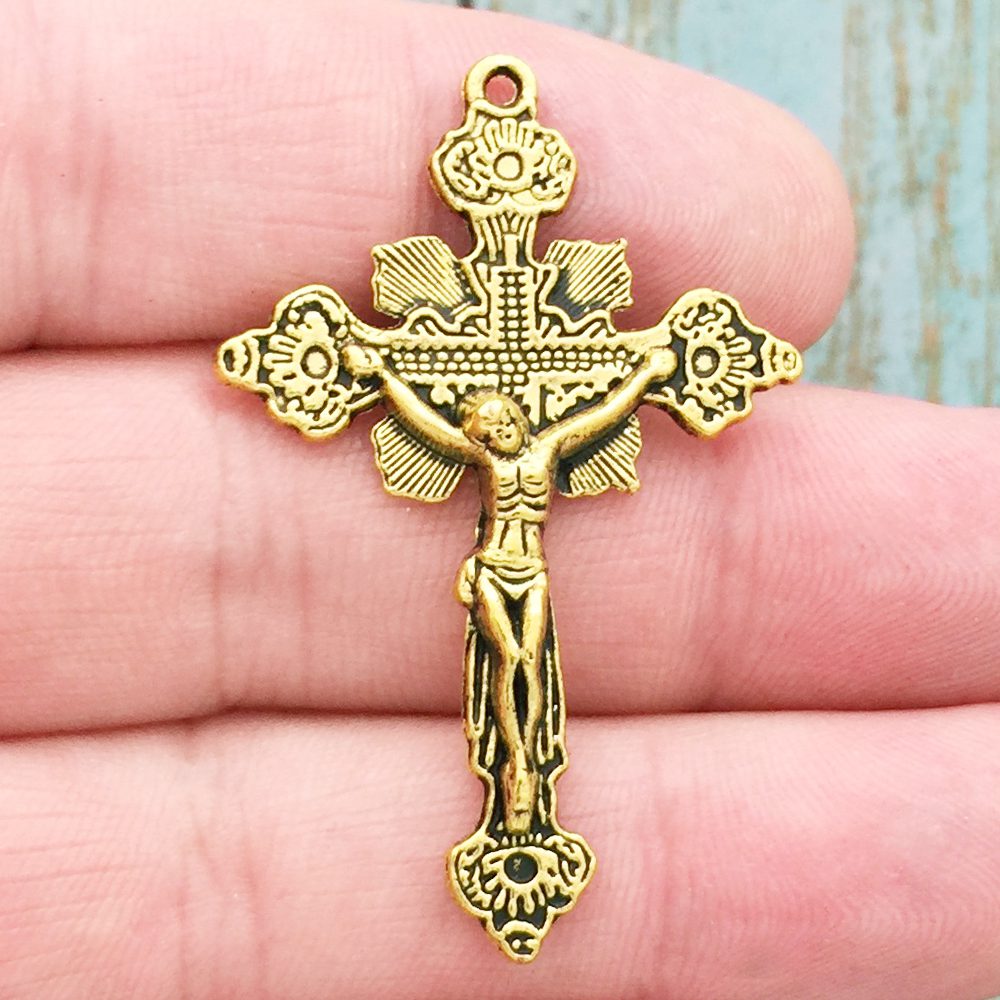 You will receive BULK 8 – Large Gold Rosary Crucifix Cross Charms in Pewter by TIJC! Use this Antique Pewter Cross for Rosary Parts in making a Catholic Rosary. These charms are a quality Pewter for all your jewelry and crafting projects!