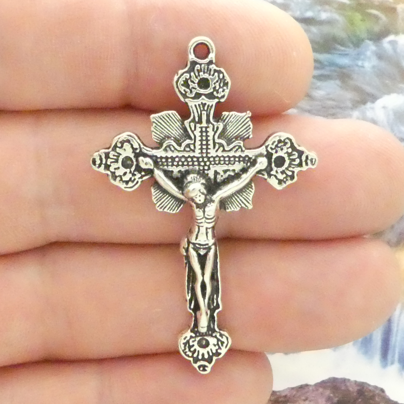 You will receive BULK 8 – Large Silver Rosary Crucifix Cross Charms in Pewter by TIJC! Use this Antique Silver Pewter Cross for Rosary Parts in making a Catholic Rosary. These charms are a quality Silver Pewter for all your jewelry and crafting projects!