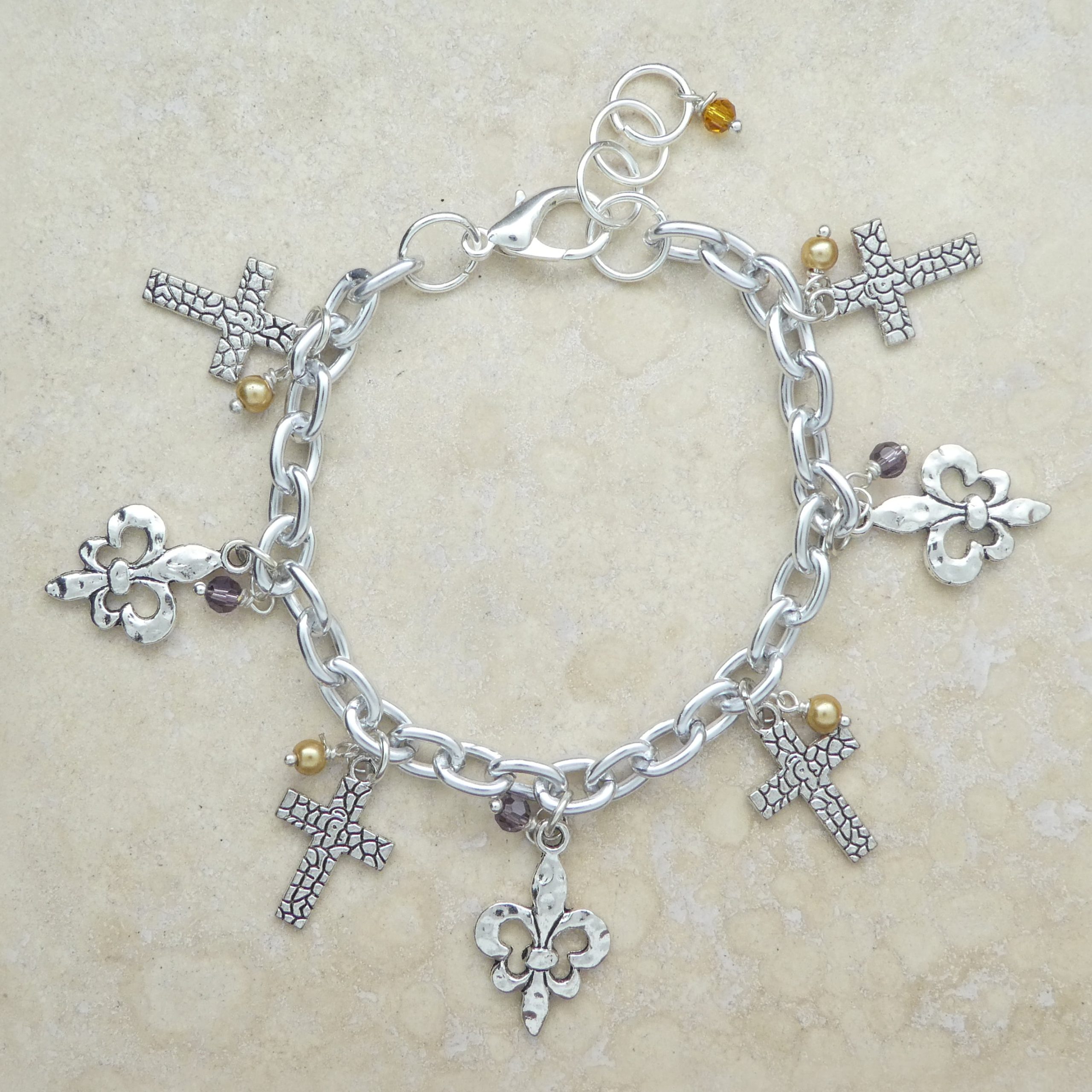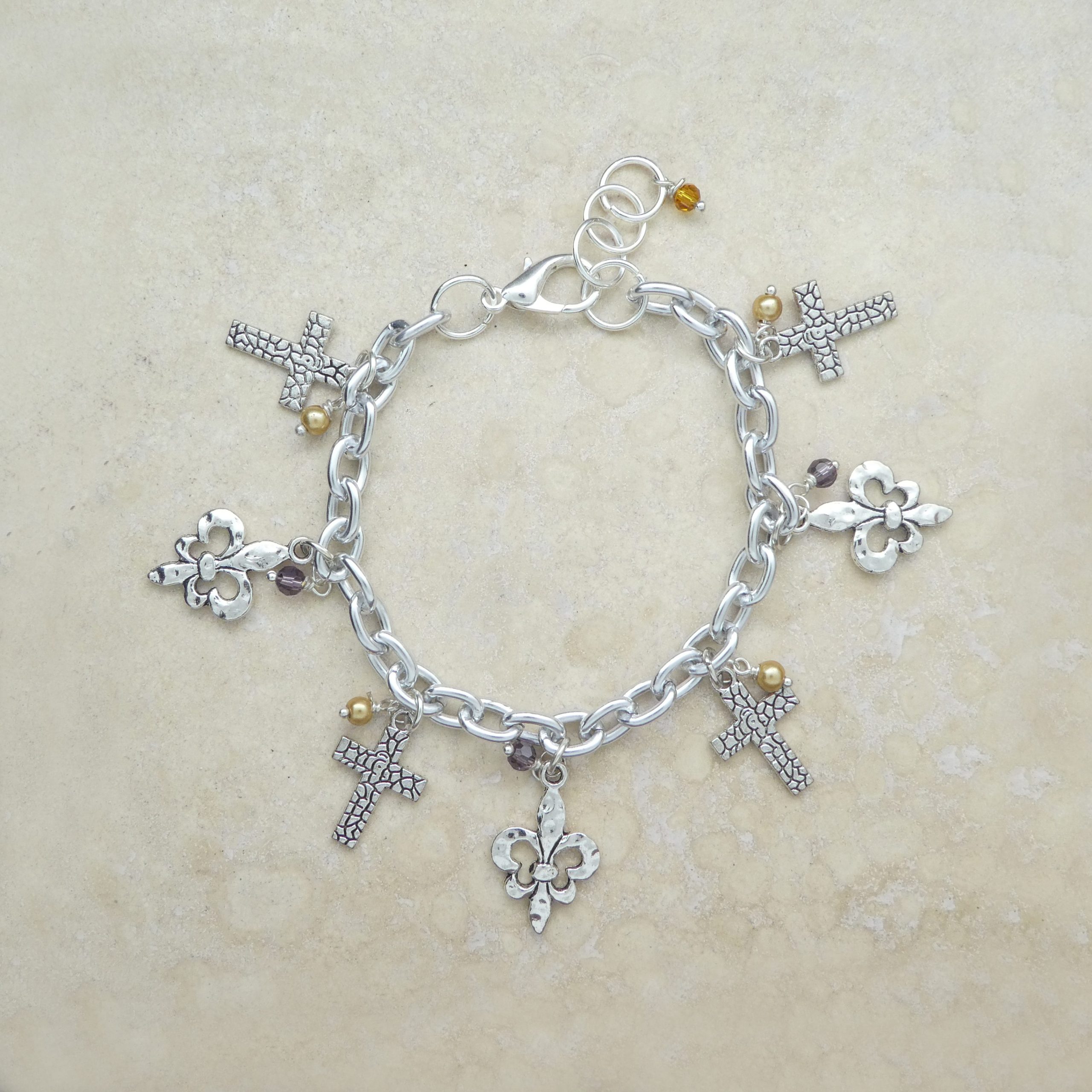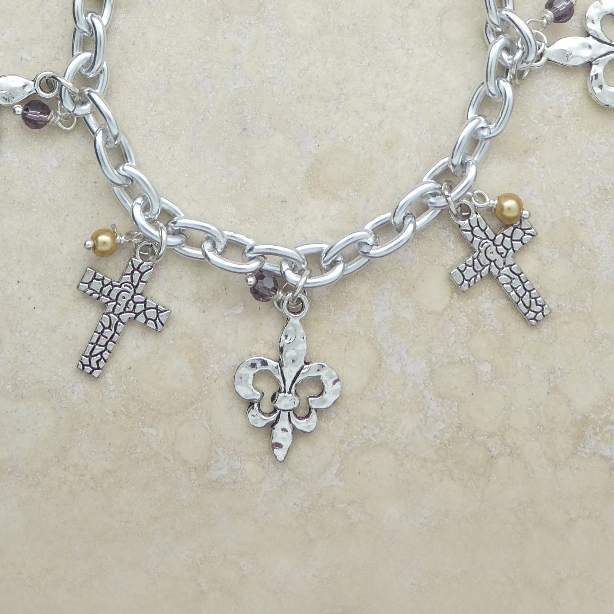 Cross Fleur de Lis Pearl and Crystal Silver Charm Bracelet 8 Inch.